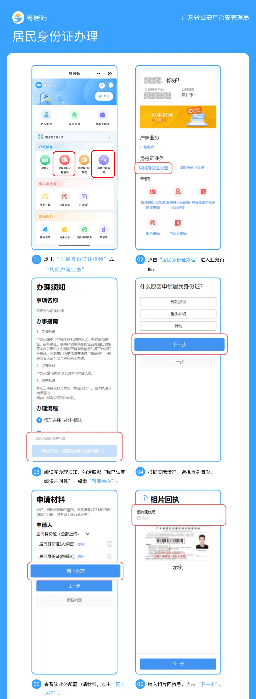 年满16周岁以上的广东省户籍居民及已开通居民身份证补换领“跨省通办”的非广东省户籍居民(暂未开通的省市有:上海市,湖南省,江西省【萍乡市除外】,新疆维吾尔自治区【部分地区】),可先到照相馆拍摄居民身份证相片,取得广东省居民身份证数字相片采集检测回执后,就近选择公安机关的身份证自助申领机办理(挂失业务需本人到户政窗口办理)。
