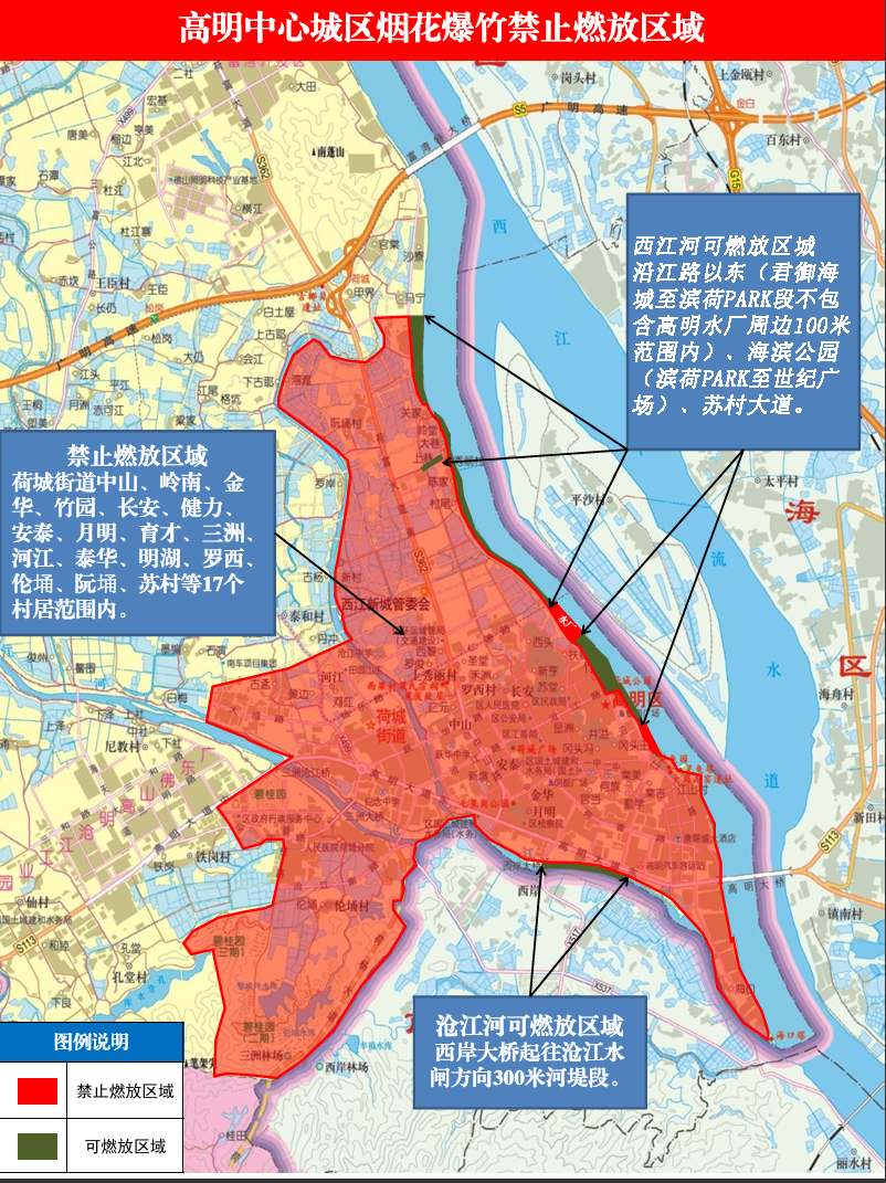 根据通告,位于高明中心城区的中山、岭南、金华、竹园、长安、健力、安泰、月明、育才、三洲、河江、泰华、明湖、罗西、伦埇、阮埇、苏村等17个村居,今年依旧被划入中心城区禁燃区 ,除特设路段外,全年不允许燃放烟花爆竹。