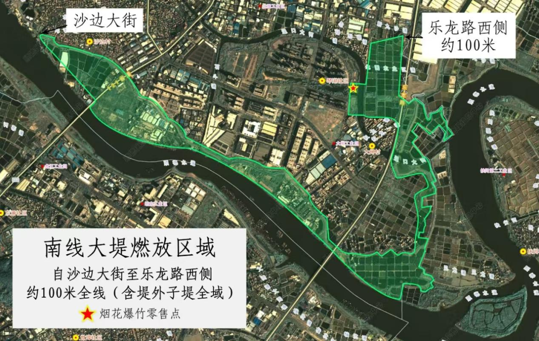 1.南庄镇:①万科情人港燃放区域;②罗南村龙湾大桥底公园燃放区域;③上元周尾围公园燃放区域;④紫南仁园燃放区域。