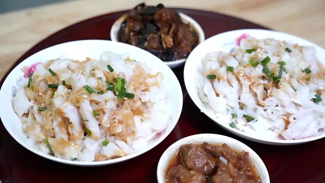 江谷窝粉,是四会人对于大米的独特创造。它由米浆制成,将米浆浇在窝篮上,拿起窝篮转上两圈,将其平铺开来再放入蒸炉里快速蒸熟。吃时先将窝粉晾凉、切碎,搭配牛腩、排骨、花生油、酱油等调料一起食用,米香味浓郁、爽口弹牙的江谷窝粉瞬间就能打动你的味蕾。