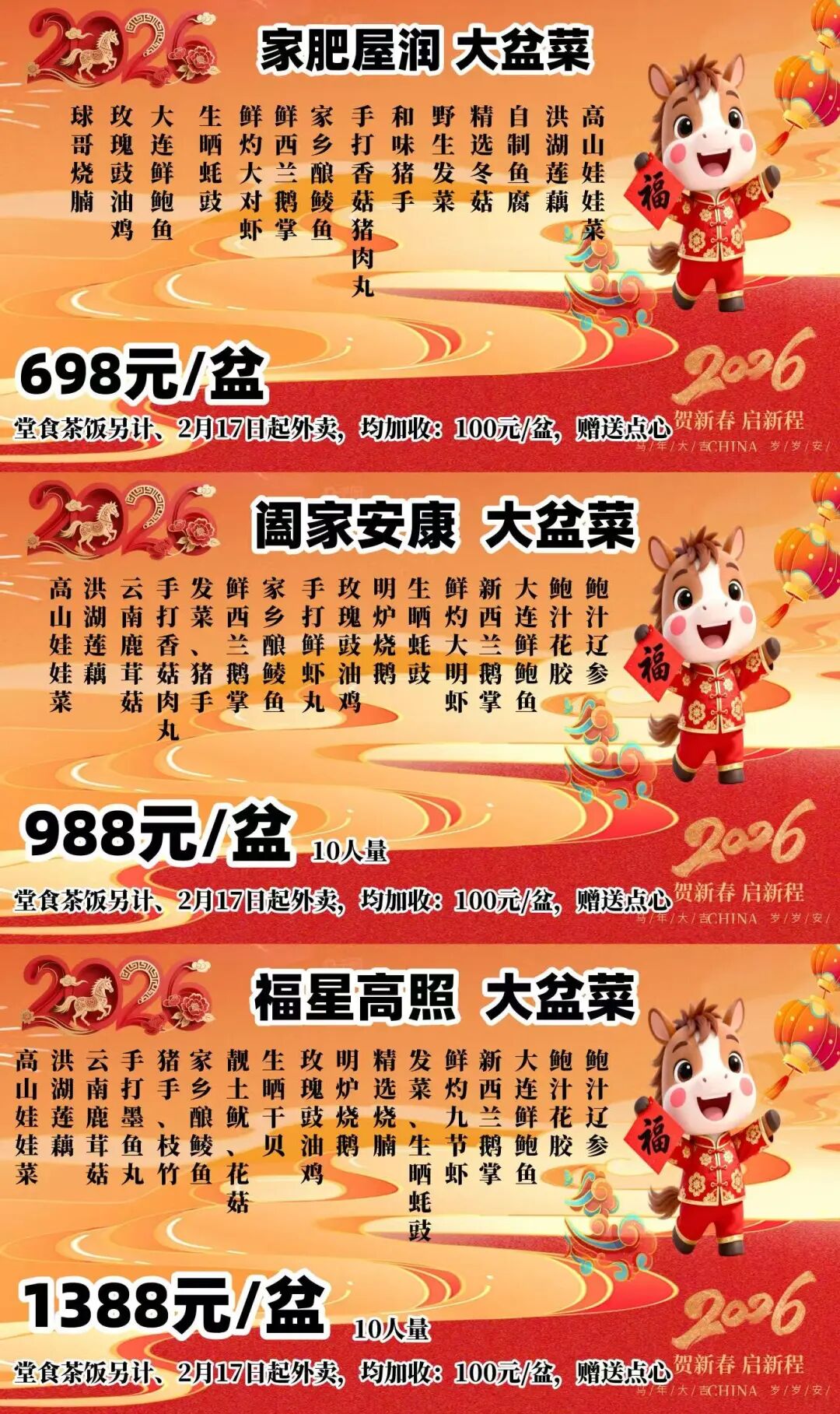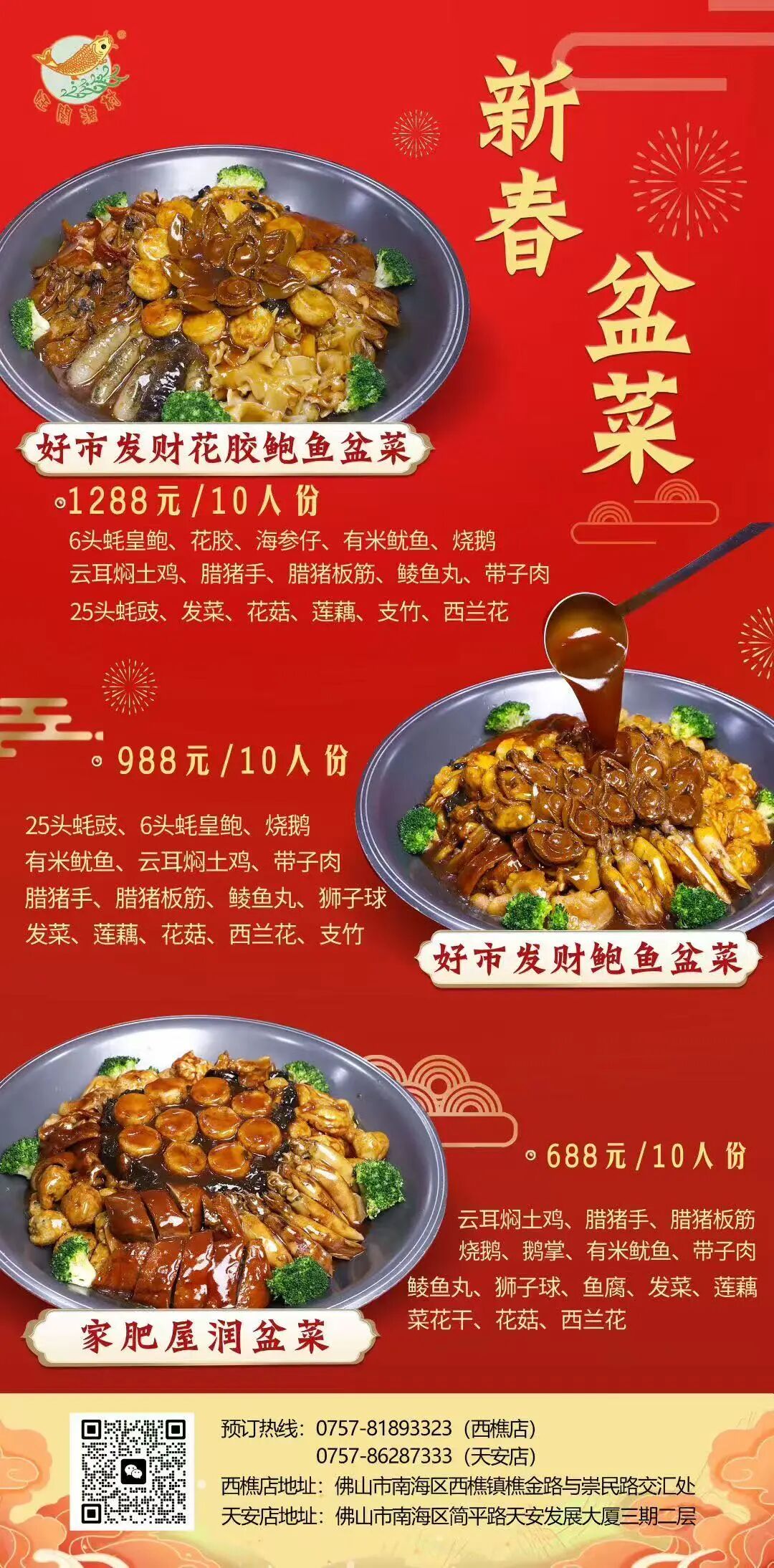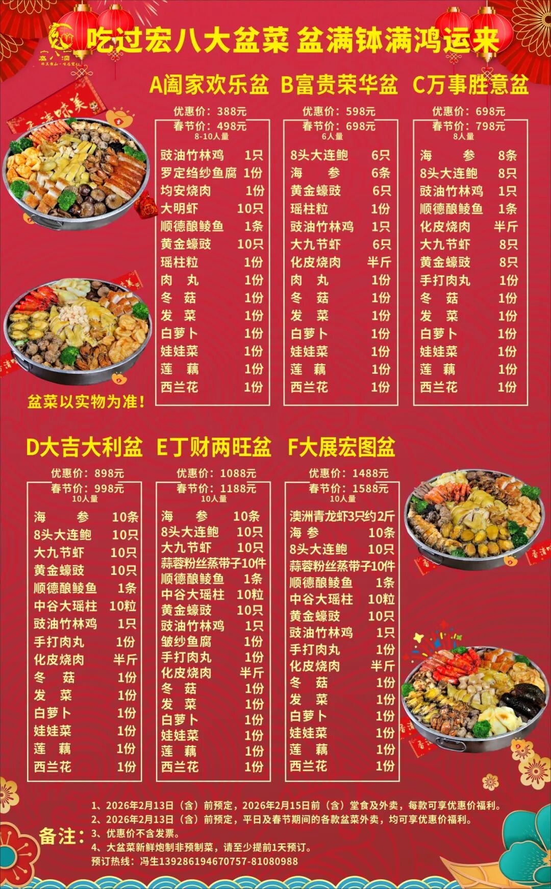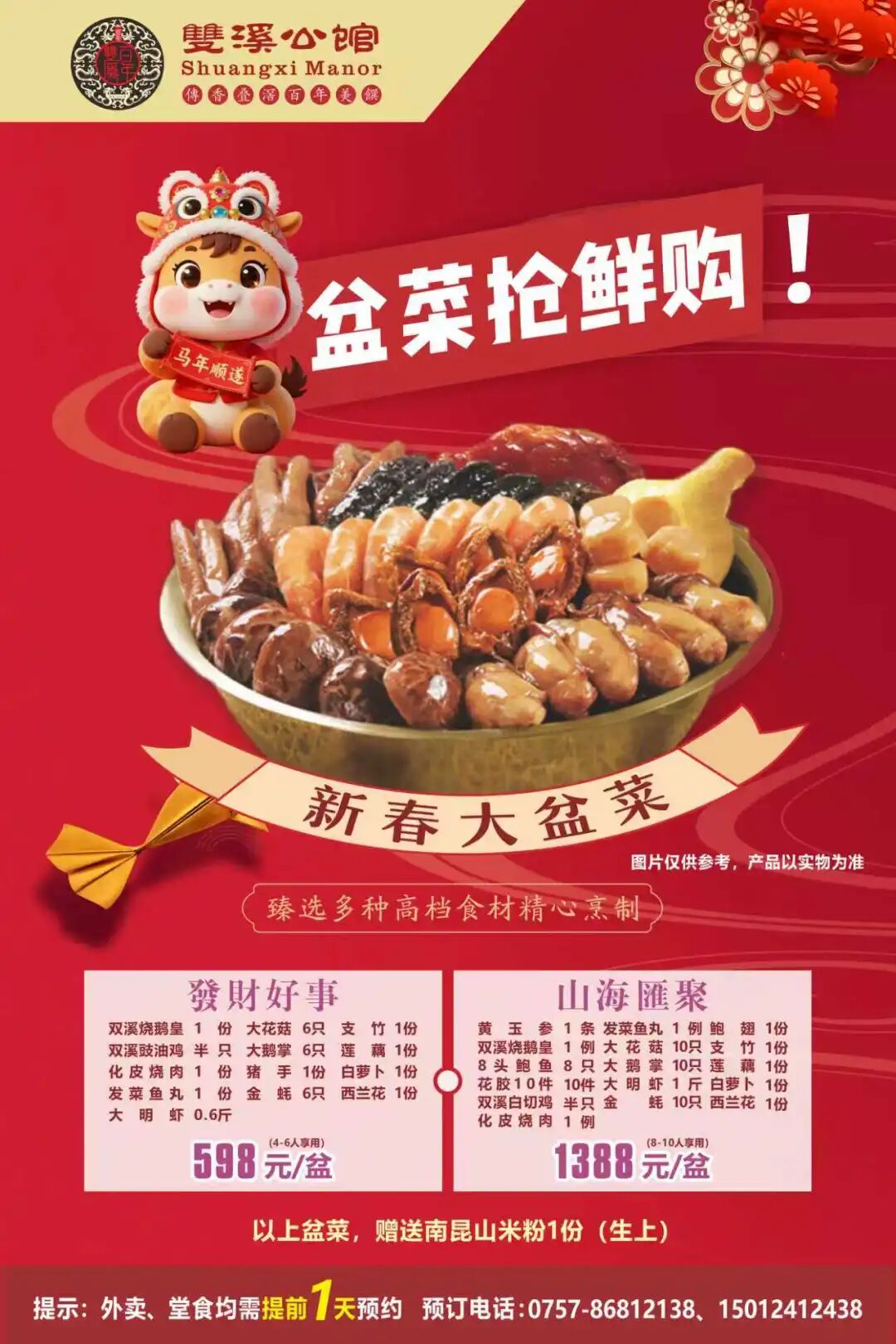注意:各款新春盆满钵满大盆菜在2月13日前预订,外卖可享优惠价(含春节期间),西樵范围内免费配送。请至少提前一天预订。新春期间正常营业。