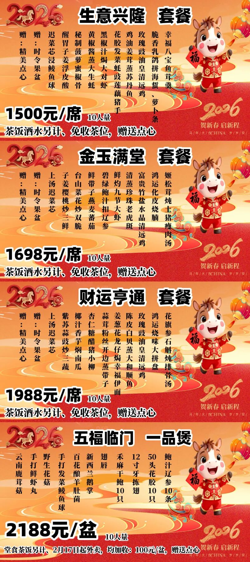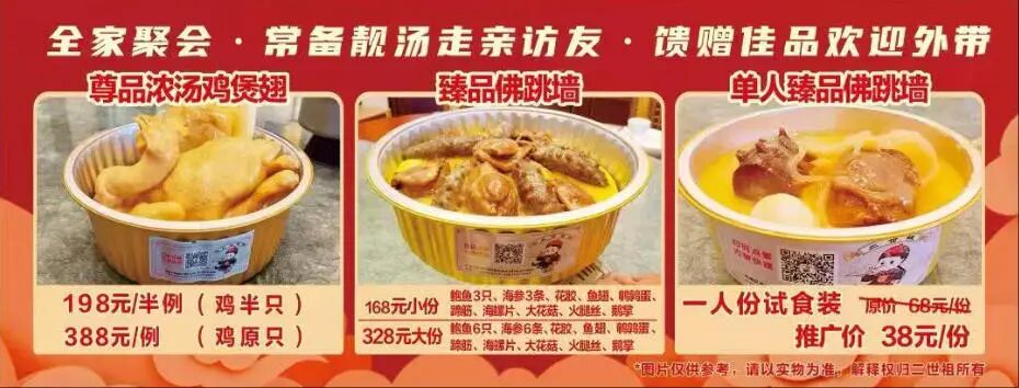 注意:凡订鲍参翅肚大盘菜,送200元消费券,春节期间2月13日至3月30日,饭市到店消费送发财点心一份,堂食及外卖平台春节期间正常营业。