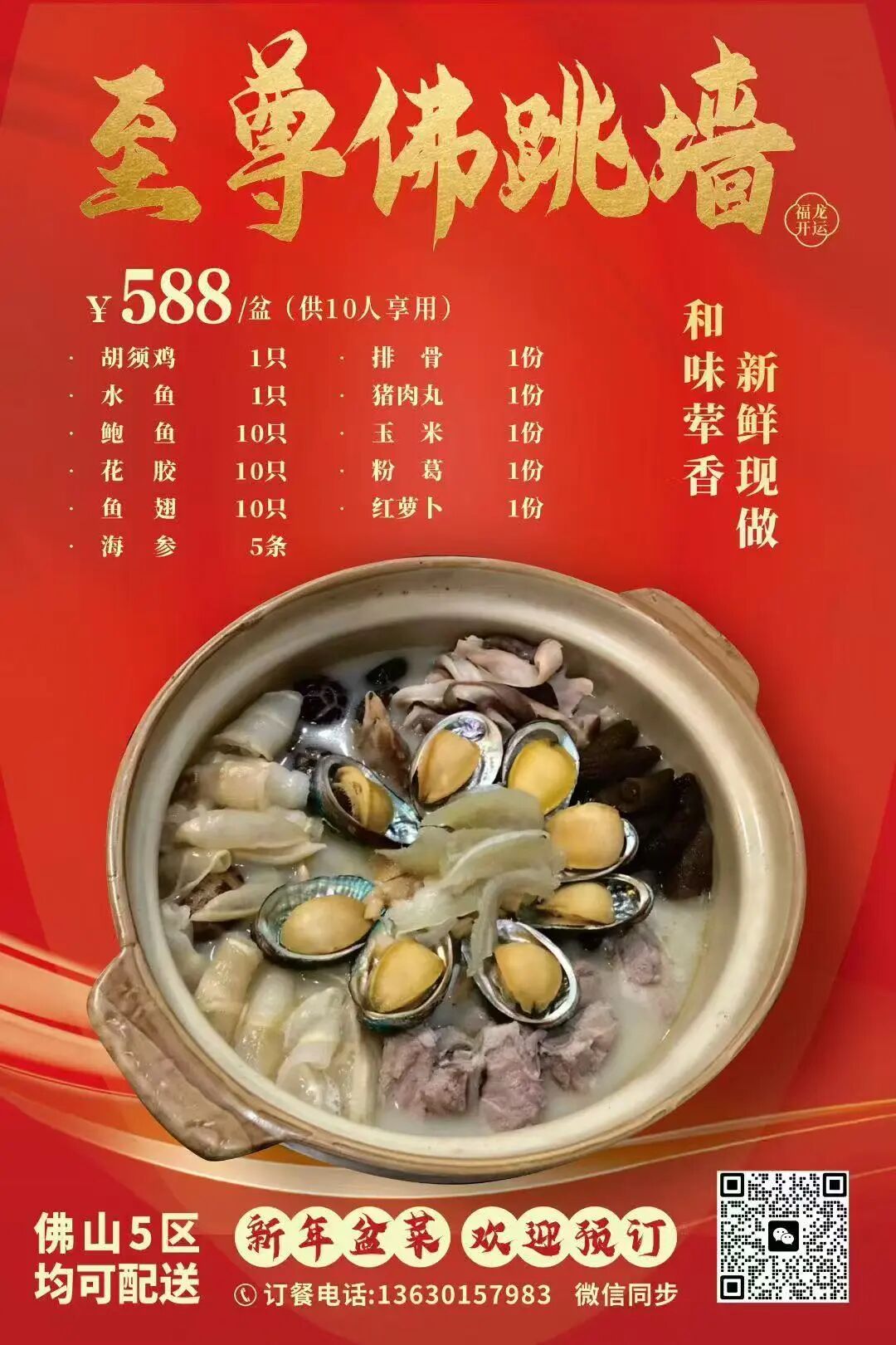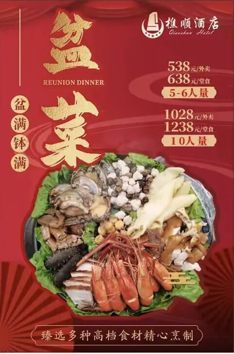 盆菜包含鲍鱼、花胶、蚝豉、玫瑰豉油鸡、美极大虾等健康食材,纯手工制作,足够10人食用。根据食材不同搭配,也可根据顾客需求私人定制,有688元、888元、988元、1038元价位可选。