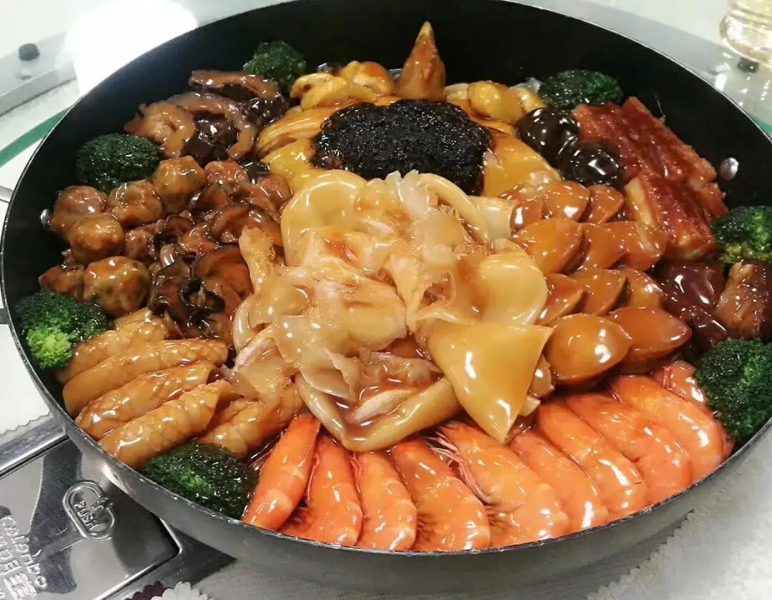 一盆地道盆菜,讲究“层层有料,味味相融”!备菜时,十余种食材需要经过煎、炸、焖、煮不同的工序,随后鲍鱼、大虾、豉油鸡、发财猪手、脆皮烧肉被错落铺叠在盆中,再衬以冬菇、莲藕、娃娃菜等配菜,层层码放,最后淋上秘制鲜汁慢炖。