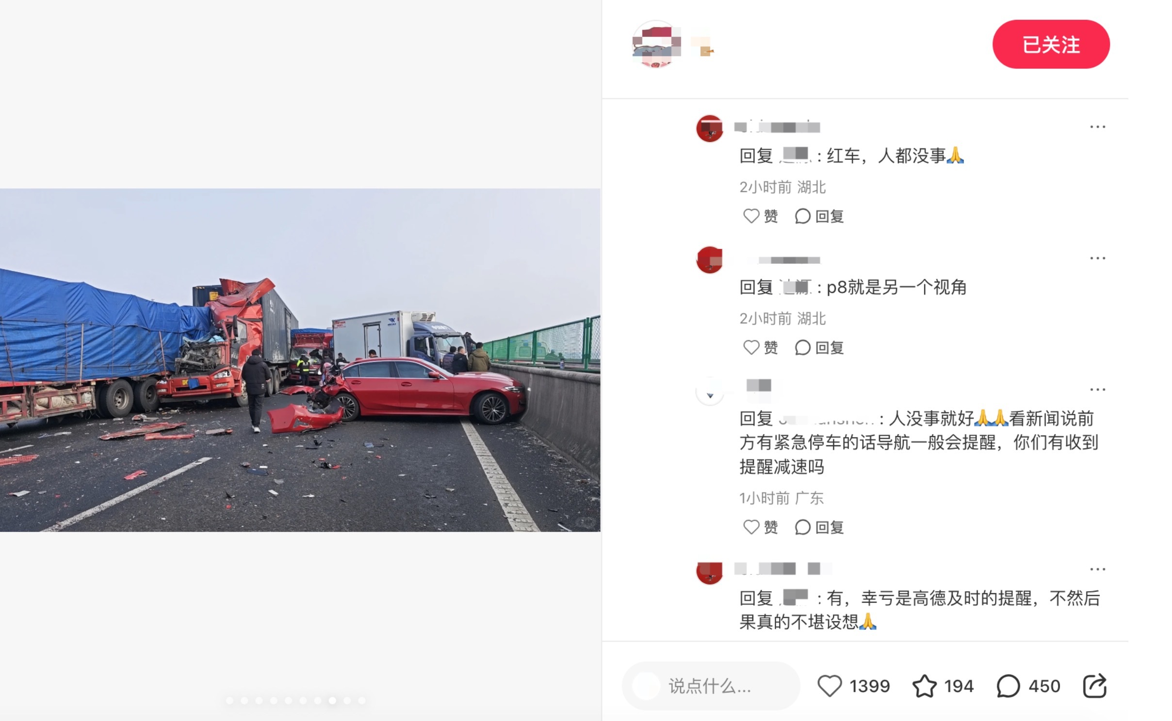 “幸亏(当时)高德及时的提醒,不然后果真的不堪设想。”上述博主称,听到导航前方紧急停车信息后有意识减速。“语音和文字都有(提醒)。”该博主对记者表示。