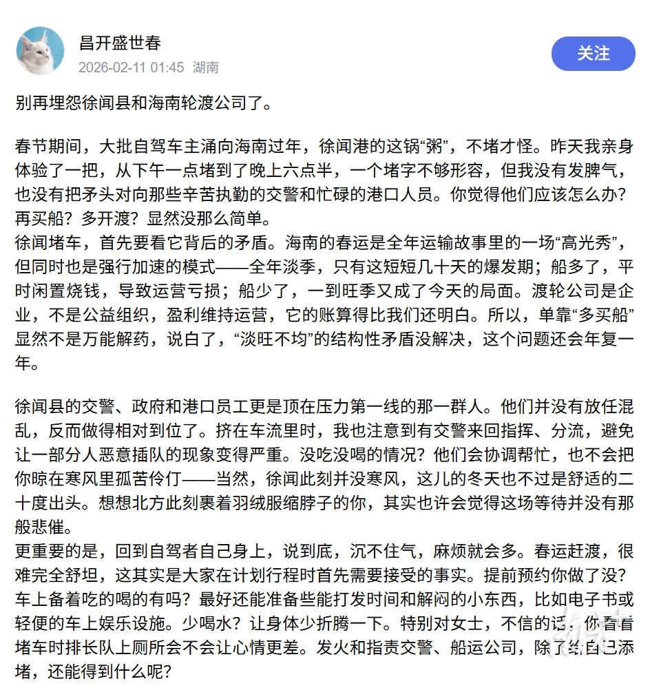 “徐闻县的交警、政府和港口员工更是顶在压力第一线的那一群人。他们并没有放任混乱,反而做得相对到位了。交警的安保措施也比过去细化不少,有序进港、有序离港的努力看得见。”网友@昌开盛世春这样评价道。