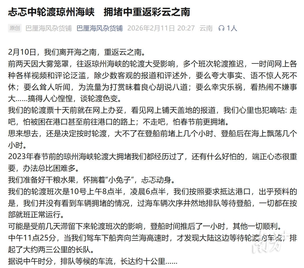 网友“巴厘海风杂货铺”说:“前两天因大雾笼罩,往返琼州海峡的轮渡大受影响,多个班次轮渡推迟,一时间网上各种各样的视频和评论泛滥,除少数客观的报道和评述外,要么夸大事实、语不惊人死不休;要么耸人听闻,为流量为打赏昧着良心胡说八道;要么幸灾乐祸,看热闹不嫌事大……搞得人心惶惶,谈轮渡色变。我们的轮渡班次是10日上午8点半,凌晨6点半,我们按照要求抵达港口,出乎预料的是,我们并没有看到车辆拥堵的情况,过海车辆秩序井然地排队等待登船,一切都在按部就班正常运行。可能是受前几天滞留下来轮渡班次的影响,登船时间推后了一小时,其他一切顺利。”