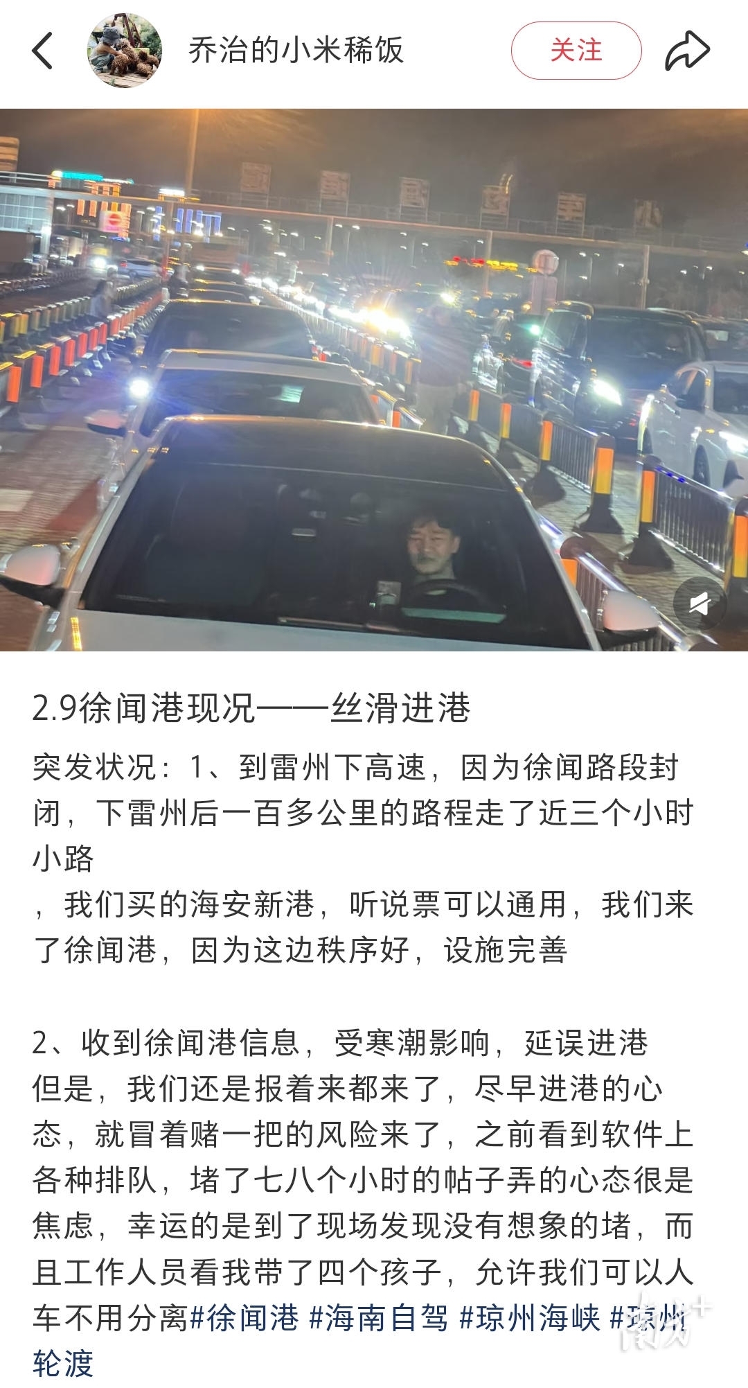网友“乔治的小米稀饭”说:“收到徐闻港信息,受寒潮影响,延误进港,之前看到软件上各种排队,堵了七八个小时的帖子弄得心态很是焦虑,幸运的是到了现场发现没有想象的堵,而且工作人员看我带了四个孩子,允许我们可以人车不用分离。”