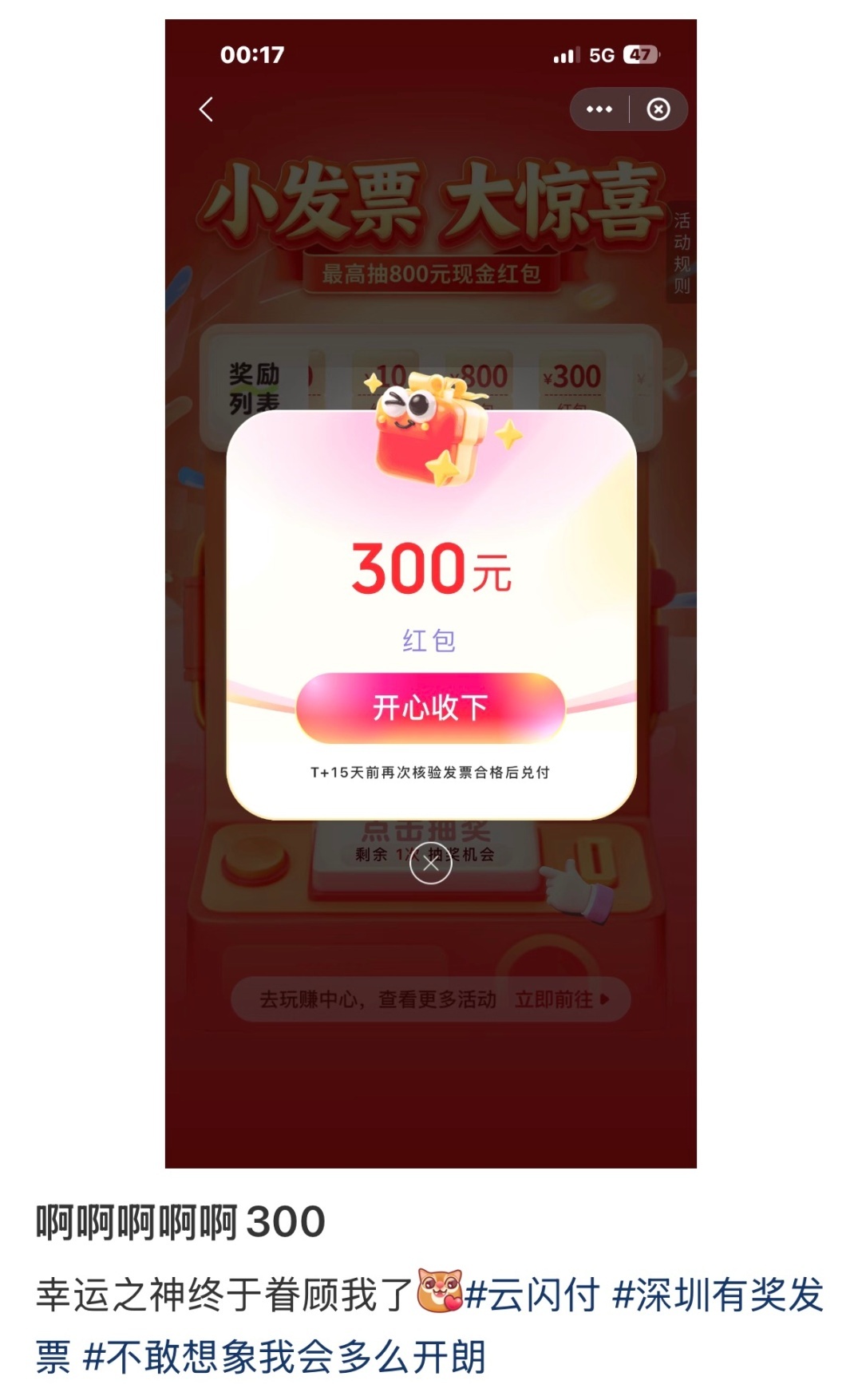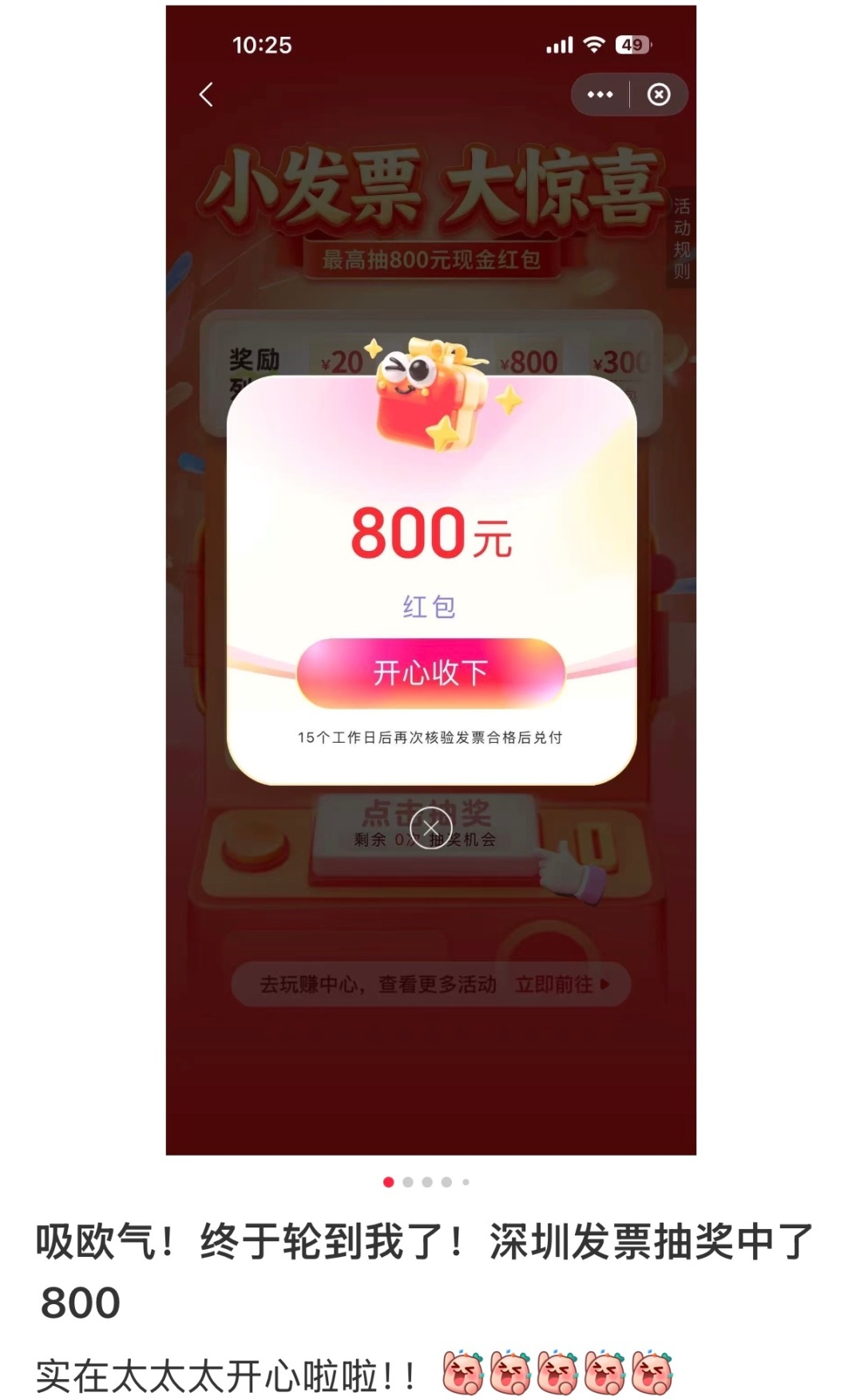 • 100元、300元、800元大额奖励采用“即时抽奖开奖、延时兑付”。中奖后,15个工作日后再次核验发票合格即可兑付奖金。活动过渡期期间,因系统调试原因,小额奖励采用24小时内兑付。
