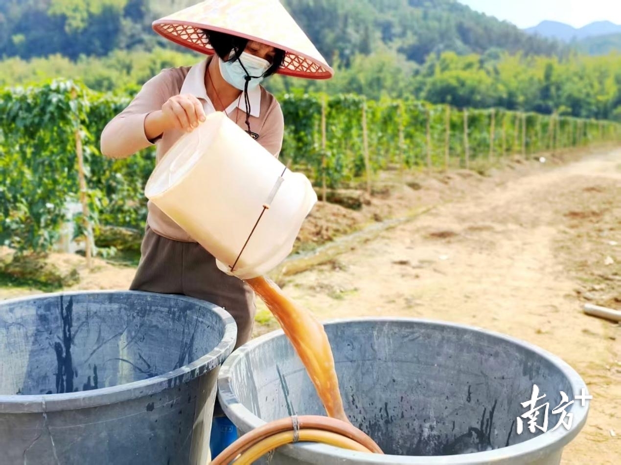 蔡文天的妻子按照科学配比调配药液,为田间管护做准备。 受访者供图