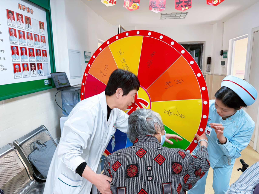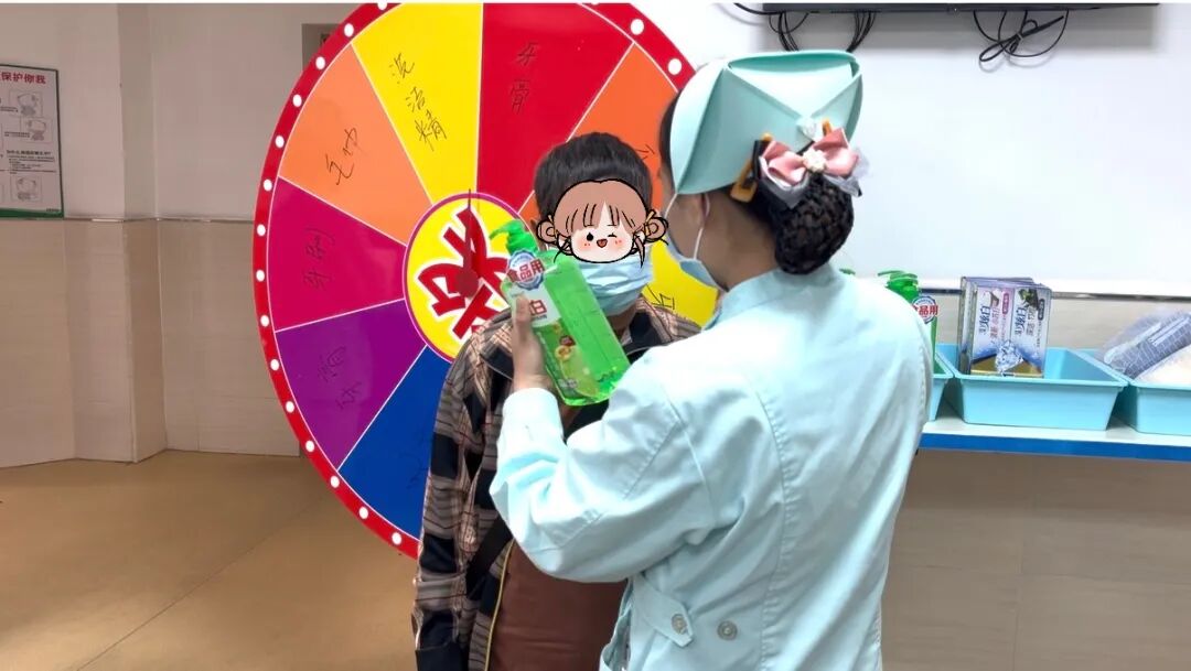 夜幕降临,血透室内依然灯火通明,医护人员推着抽奖转盘,逐一来到患者床边。病友们转动转盘、抽取问题、踊跃回答,气氛温馨又热闹。在轻松愉快的互动中,大家再次巩固了防跌倒和饮食安全的要点。