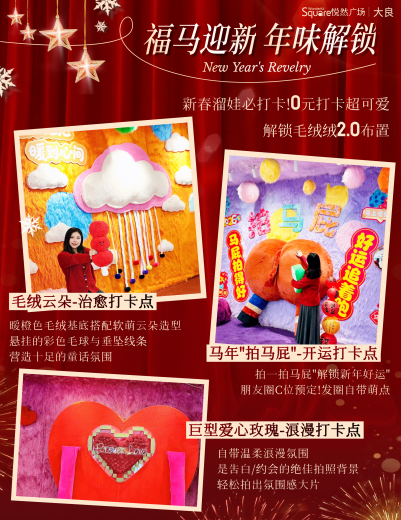 2月1-28日:解锁毛绒绒2.0新春打卡点,免费送福气小马。打卡点:1楼(阿爆柠檬茶旁)&4楼(万达影院旁)