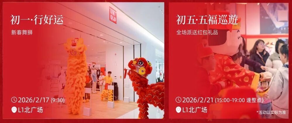 万象游春主题、L1南广场顺顺市集VoL.游春季。2月17日年初一,L1北广场新春舞狮表演;2月21日年初五,五福巡游活动,欢欢喜喜闹新春。