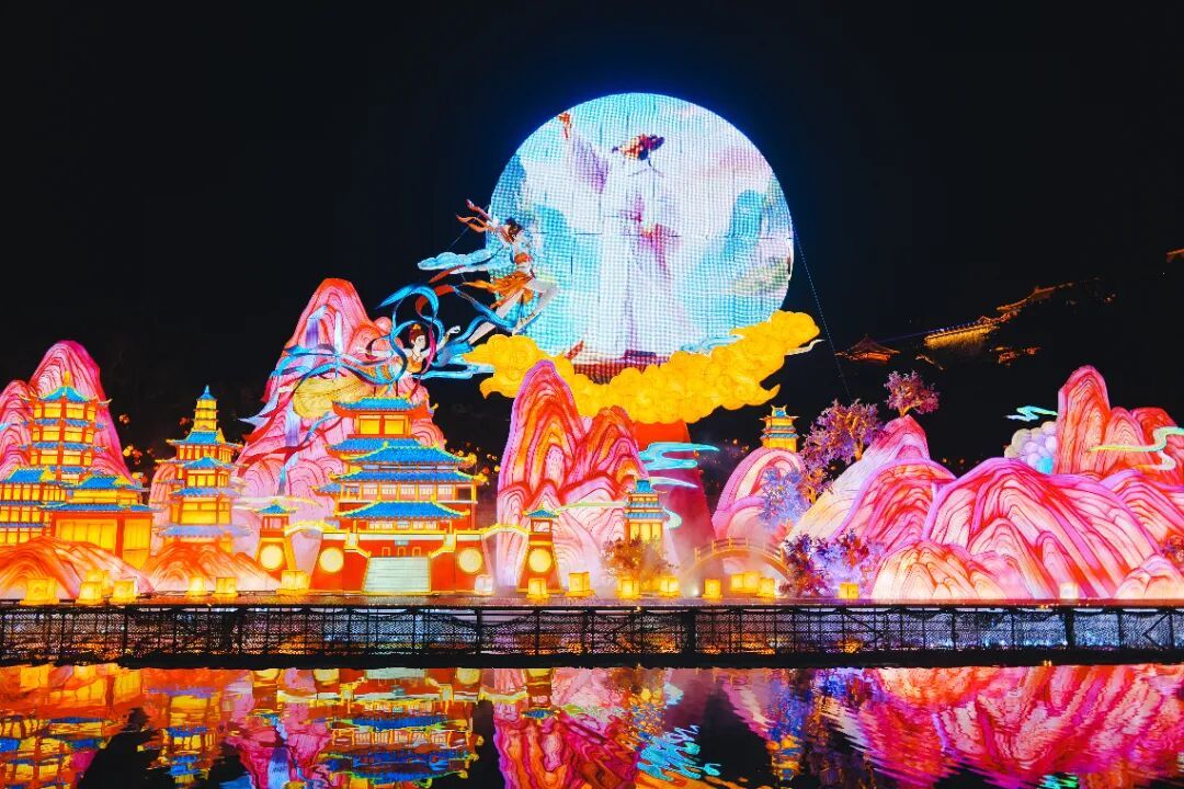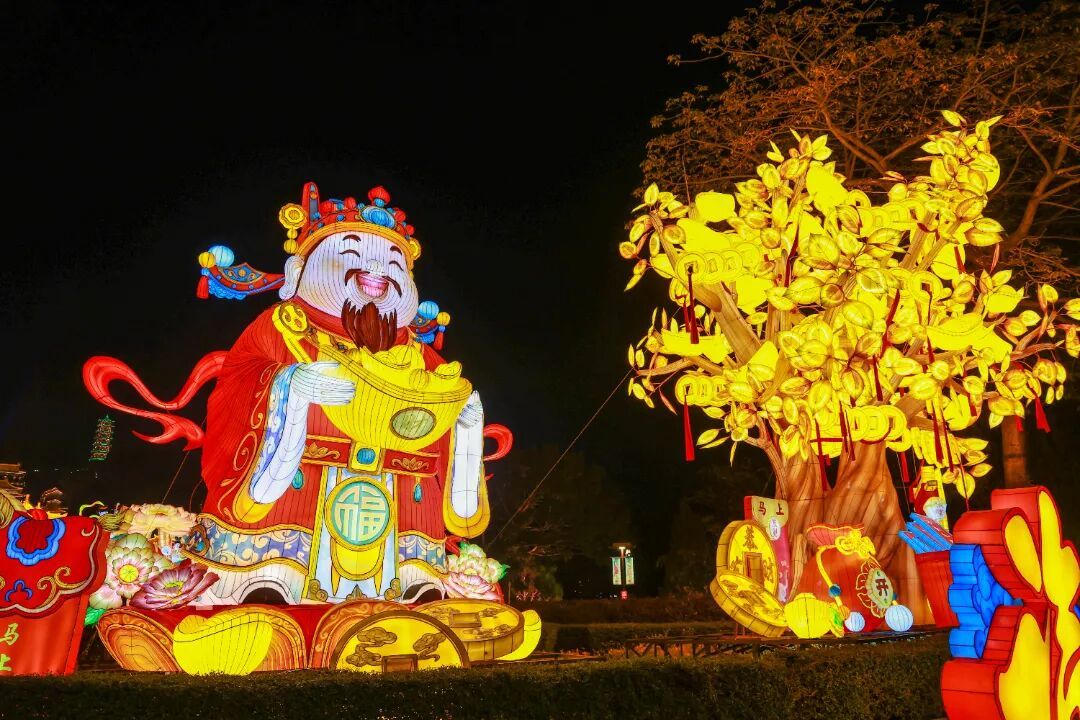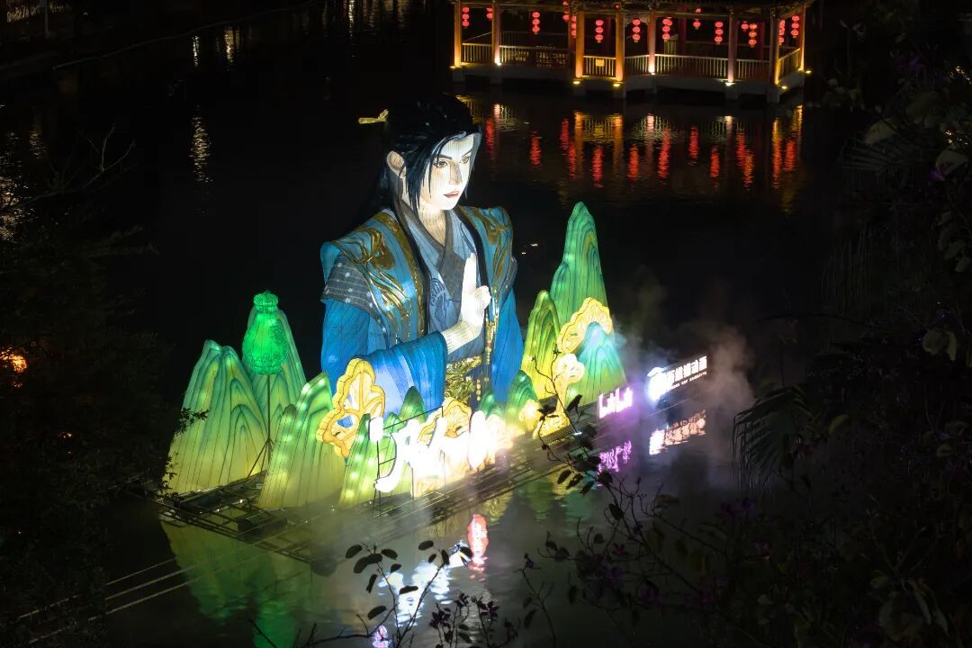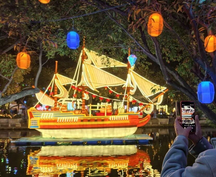 整趟灯会逛下来,只能用全程震撼形容。20米高巨型醒狮灯、百米水上 “万马奔腾” 灯组、11米高 “大吉大利” 灯……85组华灯流光溢彩宛若星河倾泻。你可以穿越回古代,当一回海商;也可以在诗词里漫步;或者到360°球幕剧场躺着看大片。