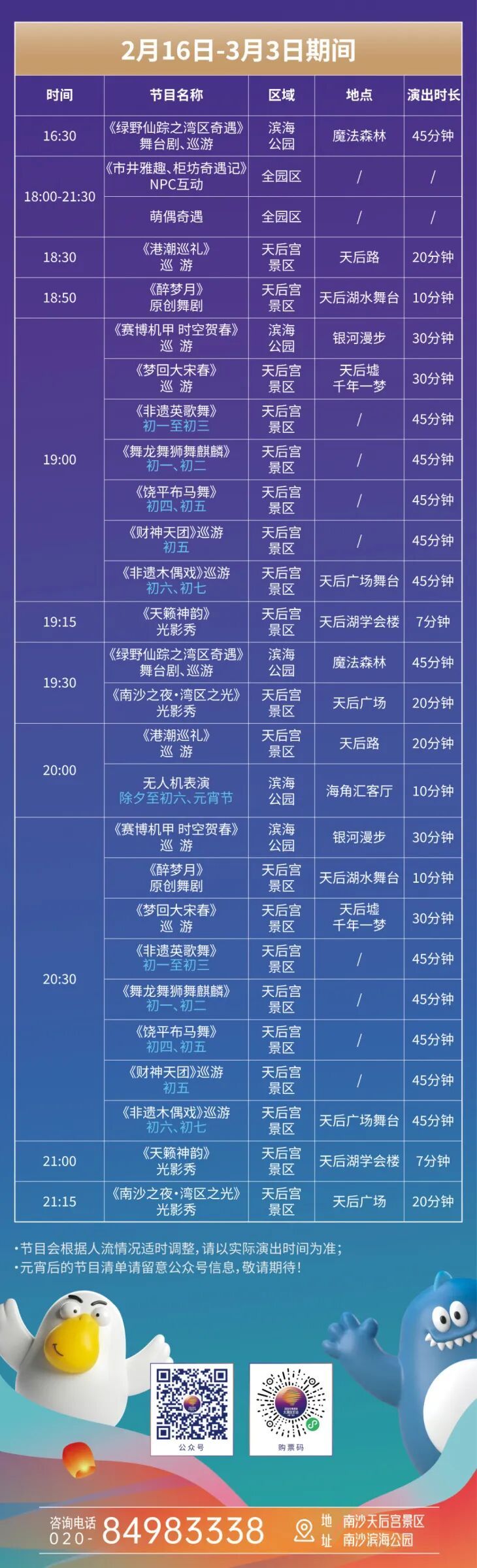 绝美灯光秀+无人机表演盛宴!来看看那些刷爆朋友圈的春节限时看点:即日起至5月10日《南沙之夜·湾区之光》灯光秀;即日起至2月22日、3月3日(除夕至初六、元宵节1000架次无人机表演;还有英歌舞、非遗木偶戏巡游、饶平布马舞等陪你过大年。