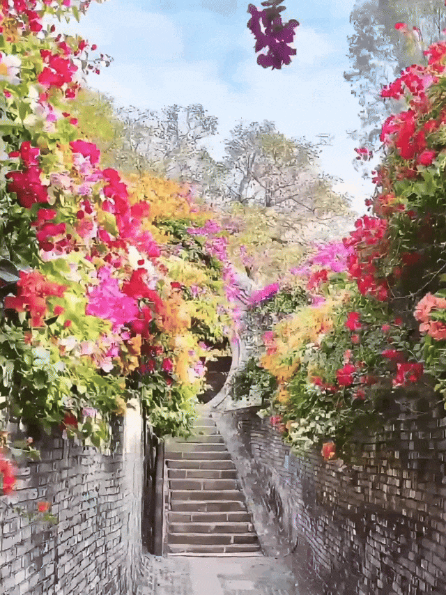马岭观花植物园颜值担当、必打卡点——霓裳园!3000+品种三角梅汇聚成彩色瀑布,从镬耳墙头倾泻,在镂空花窗旁摇曳,与青砖黛瓦相映成画。古风写真或日常打卡都超出片!
