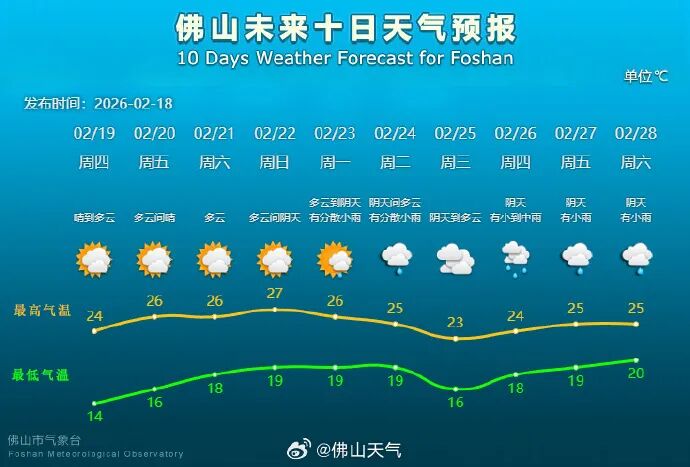 2月23日,多云到阴天,有分散小雨,气温19℃~26℃。