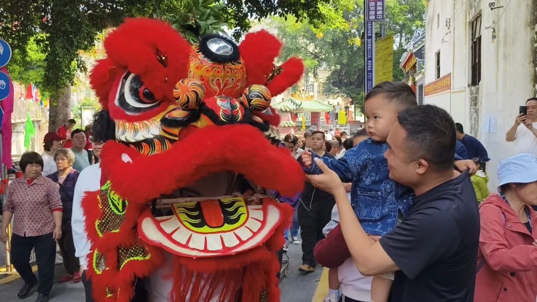 中午12时整,随着鞭炮齐鸣,巡游队伍正式出发。仪仗队鸣锣开道,锣鼓柜、色柜紧随其后,彩旗飘扬,罗伞簇拥。醒狮队伍沿途助兴,锣鼓铿锵,八音缭绕。队伍穿行于村内各坊社,祈求国泰民安、风调雨顺,将春日的喜庆洒满众涌村的街巷。