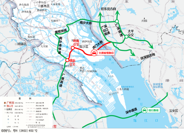 深中通道的开通,一定程度缓解了虎门大桥、南沙大桥的交通压力,当遇莞佛高速(坦尾立交-虎门大桥段)行车缓慢时,可通过南沙大桥、深中通道绕行至广深沿江高速或广深高速。