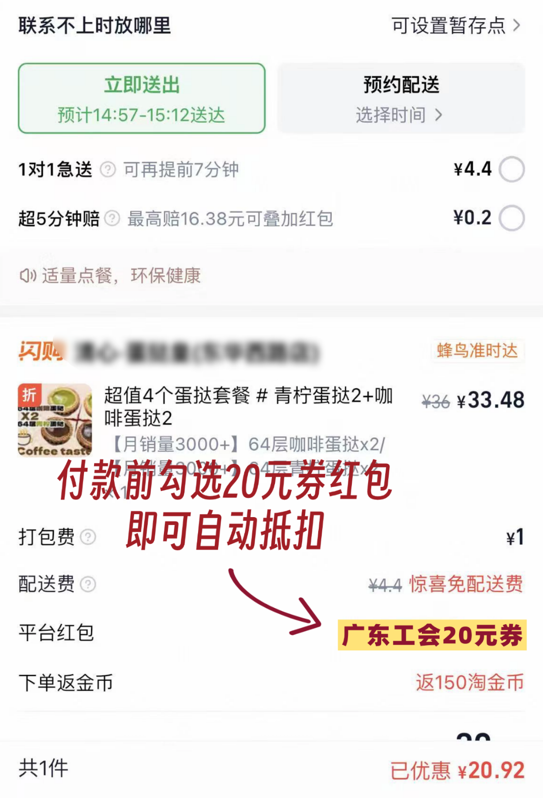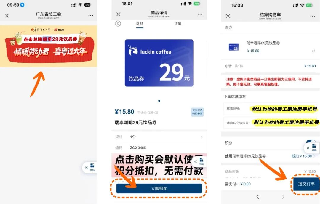 瑞幸29元饮品券 共3000张 兑奖说明: 1、本奖品需要自行兑奖。 2、2月27日16点后,中奖职工可识别下方二维码登录兑奖网站,用本人的粤工惠注册手机号登录——点击“兑换瑞幸29元饮品券”——点击“立即购买”(账号会有积分可以抵扣个人无需额外付款)——点击“提交订单”——充值成功(10分钟内到账)。 3、兑奖咨询电话:4006011060 使用方式: 1、充值成功后,饮品券将在10分钟内到账。用粤工惠注册手机号登录“瑞幸咖啡小程序——我的——礼品卡——历史记录——已收到”中查收饮品券。确定到账后,回到点单页面选饮品,在付款页面勾选对应卡券使用。(必须用粤工惠注册手机号登录瑞幸才能查看饮品券) 2、瑞幸咖啡饮品券适用于自制饮品,大师咖啡、水果茶等。饮品套餐、甜品 、烘焙轻食、零食、果汁、坚果、酸奶、周边潮品等不能使用。 3、瑞幸咖啡饮品券可抵扣相应面额的商品费用,但不包含风味糖浆、奶油等辅料及配送费,优惠不同享,不设找零,超额需要补差价,不退换,不折现。 4、面值该如何选择:按照饮品的原价,注意是原价,不是瑞幸的折扣价,比如原价29元的饮品就购买29元的面值。 ⌚使用有效期: 具体使用期限请以卡券页面为准,逾期使用视为放弃奖品,且不予补发。 淘宝闪购20元代金券 共2850张 兑奖说明: 本次奖品将在2月27日16点后,统一发放到中奖职工的淘宝闪购账户里。(注意:请务必使用粤工惠注册手机号登录淘宝闪购,才能查收到券) 使用方式 2月27日16点后,可登录淘宝闪购APP或者淘宝APP,查看该代金券。选好商品后在下单付款页面即可选择该券进行抵扣使用。 查看路径: 【淘宝闪购APP】我的—红包卡券—广东工会20元券 【淘宝APP】闪购—红包—我的红包—广东工会20元券 使用规则: 1、满20元可用(使用门槛=商品现价+打包费,果蔬商超不含打包费),红包平台通用,不限商户类型; 2、仅限外卖配送订单使用; 3、实付金额不低于0.01元; 4、该券只能一次性使用,不支持折现; 5、商家可用代金券数量有限,具体可用情况以订单支付时页面显示为准。 ⌚使用有效期: 有效期7天,自领券成功后7天内有效,逾期未核销视为放弃奖品,且不予补发。 南沙灯会门票1张 共1200张 兑奖说明: 中奖职工在3月4日至5月10日期间,可直接刷本人身份证免费入园1次。(咨询电话020-39392806) 使用地点: 广州南沙天后宫景区及滨海公园 ⌚可用时间: 3月4日至5月10日,每日16:00至22:30开灯,周末节假日通用。 灯会介绍: 灯会规划面积超50公顷,设置五大主题展区,展出百组大型灯景及万盏彩灯。还设有主题灯光秀、主题演艺、新春集市、电竞比赛、无人机编队表演。
