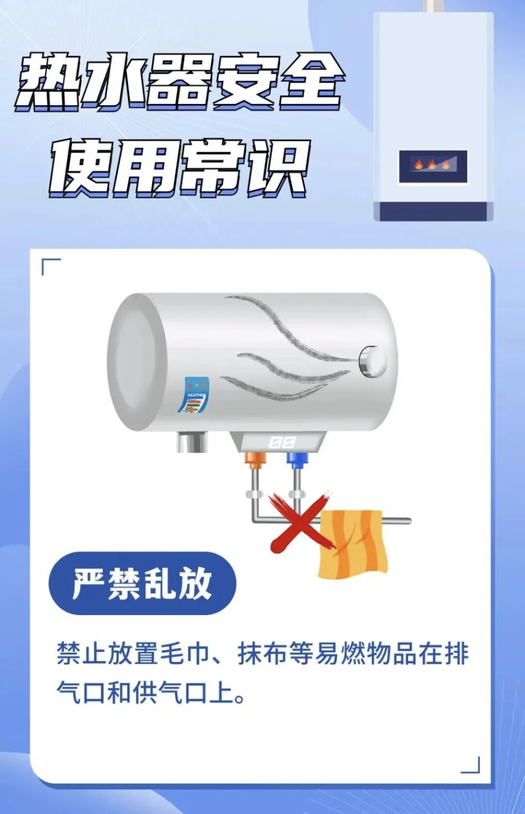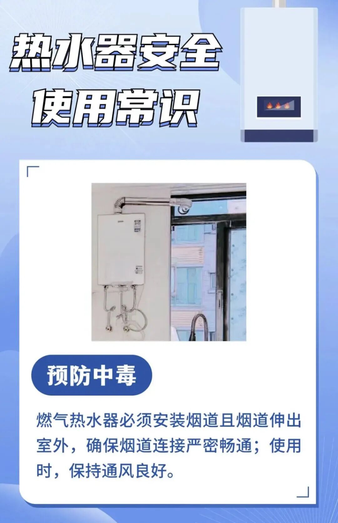 ■家中禁止使用直排式热水器和烟道式热水器,建议选用更加有安全保障的强排式热水器和平衡式热水器。