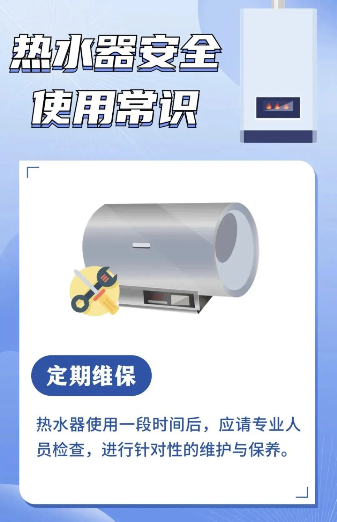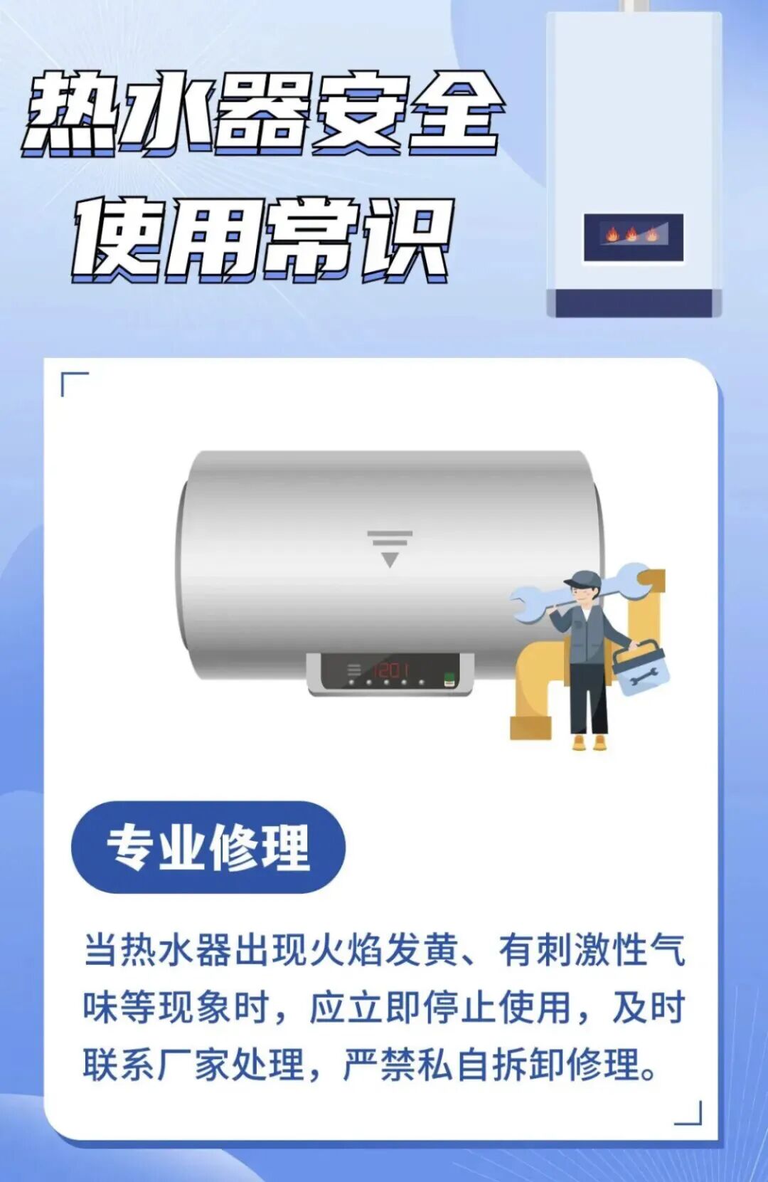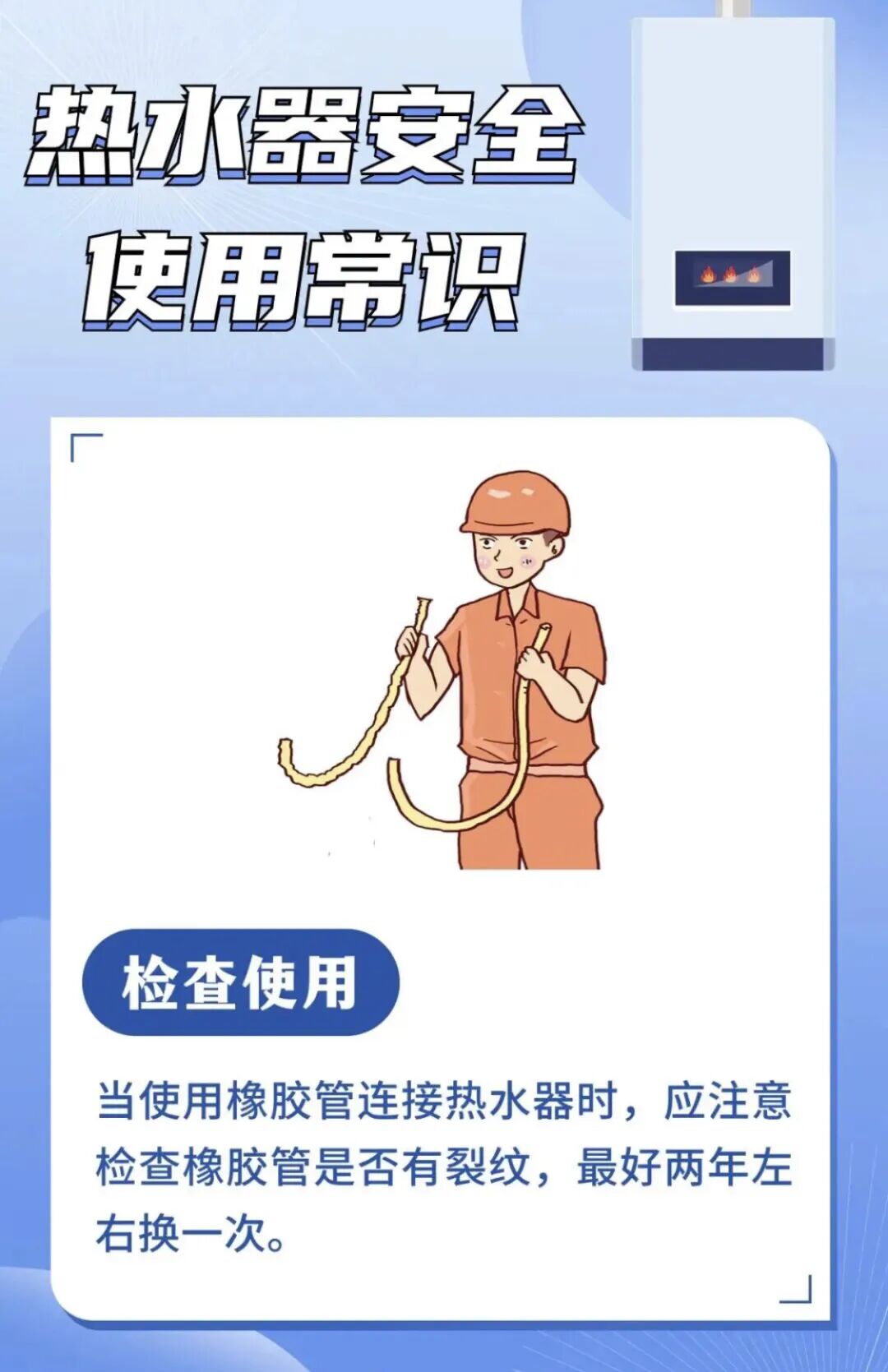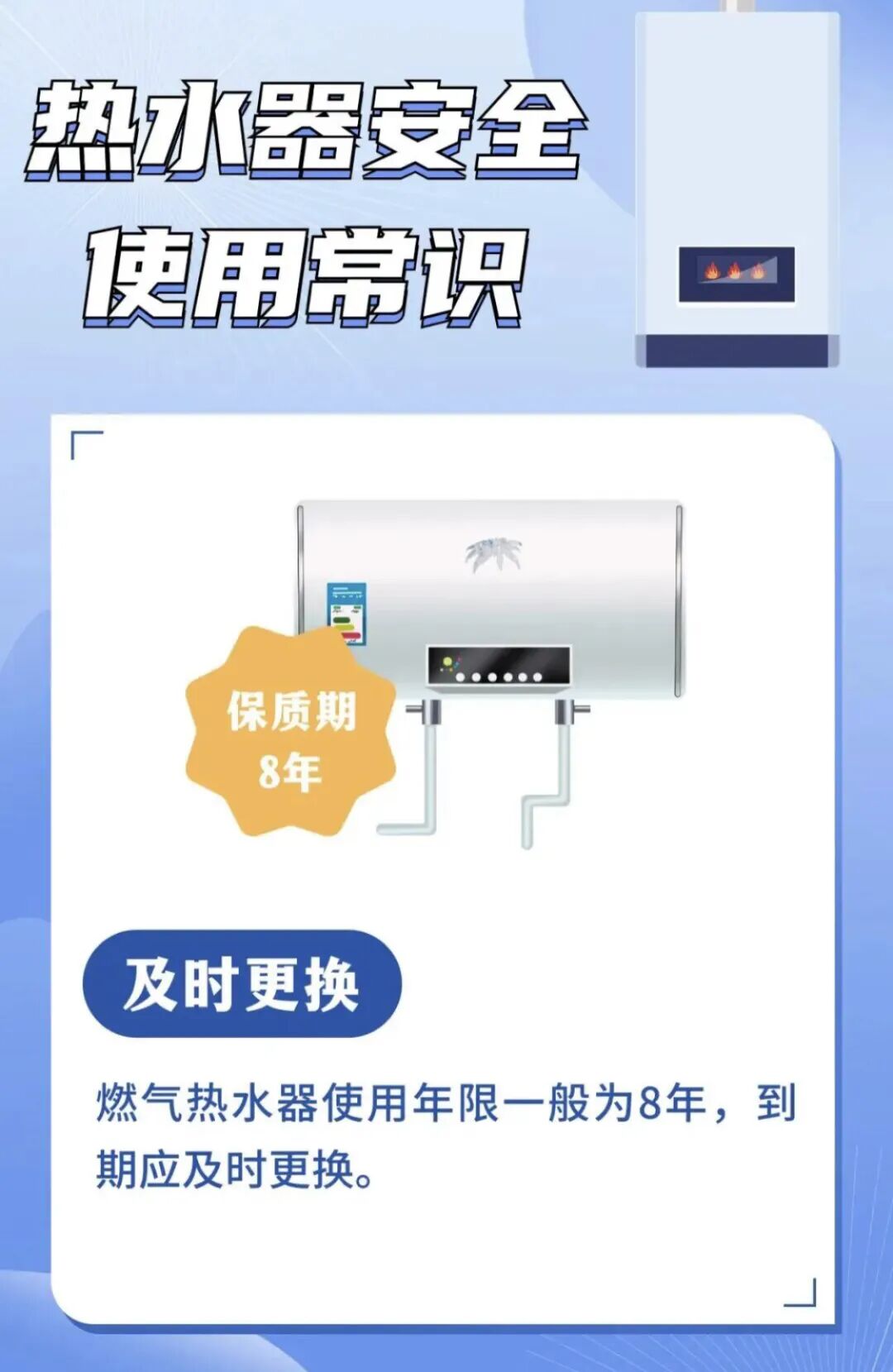 ■参考国家标准《家用燃气燃烧器具安全管理规则》(GB 17905—2008),燃气热水器的报废年限一般为8年,消费者应结合产品说明书上的产品使用年限,及时淘汰更换家中存在安全隐患的老旧热水器。