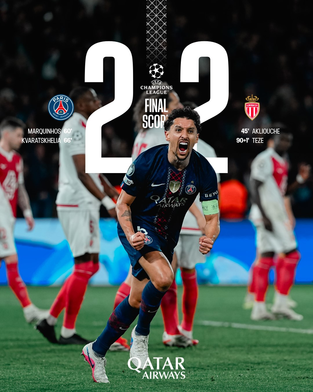 北京时间2月26日凌晨4点,巴黎圣日耳曼主场迎来次回合对阵摩纳哥的较量,首回合大巴黎客场一球小胜。上半场比赛,马马杜-库利巴利门前失良机,阿克利乌什破门先拔头筹。易边再战,马马杜-库利巴利连吃两黄被罚下,摩纳哥只能十人迎战,马尔基尼奥斯、克瓦拉茨赫利亚分别建功,特泽补时阶段扳回一城。最终,巴黎圣日耳曼主场2比2战平十人摩纳哥,总比分5比4淘汰对手,晋级淘汰赛阶段。