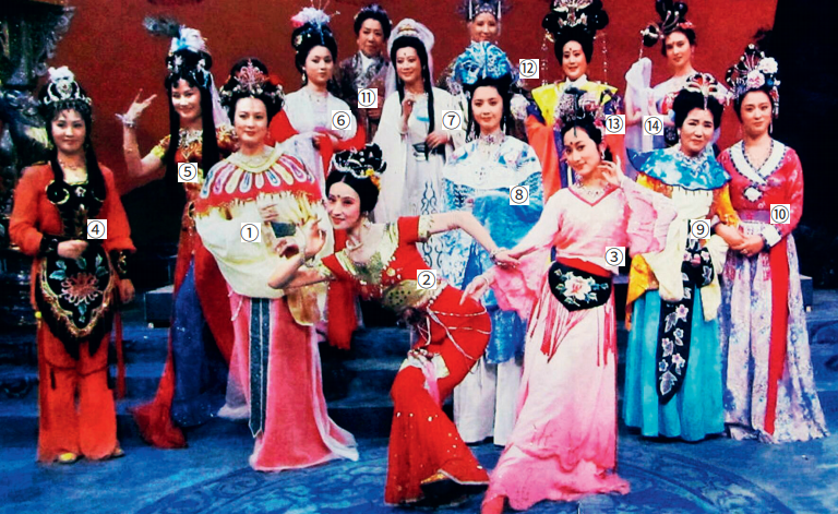 参加 《齐天乐》 晚会中的女演员合影,①乌鸡国王后(向梅饰)、②仙鹤(张京棣饰)、③杏仙(王苓华饰);④铁扇公主(王凤霞饰)、⑤朱紫国王后(詹萍萍饰)、⑥殷小姐(马兰饰)、⑦观音菩萨(左大玢饰)、⑧女儿国国王(朱琳饰)、⑨车迟国王后 (赵丽蓉饰)、⑩宝象国公主(刘冰饰)、⑪高老太(高玉倩饰)、⑫黎山老母(孙凤琴饰)、⑬王母娘娘(万馥香饰)、⑭嫦娥(邱佩宁饰)