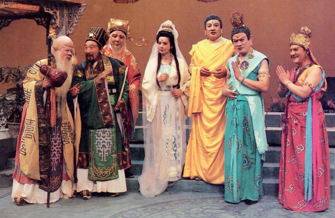 参加《齐天乐》晚会的各路神仙佛祖,右起分别为文殊菩萨(赵权饰)、普贤菩萨(郭威饰)、如来佛祖(朱龙广饰)、观音菩萨(左大玢饰)、福禄寿三星(分别由杨玉章、李润声、安云武饰)
