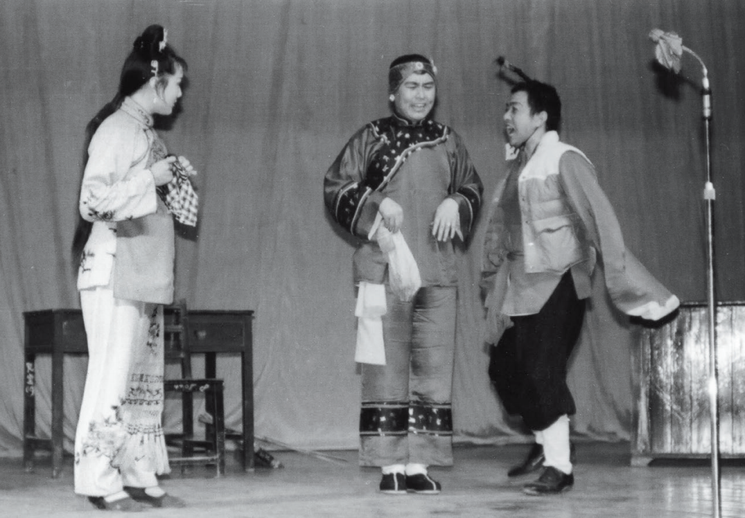1983 年 3 月,在湖南省委礼堂,杨俊(左)、马德华(中)和项汉(右)表演小品《柜中缘》。在长达数年的拍摄过程中,剧组曾多次组织小型文艺演出,积累了丰富的舞台经验和团队默契