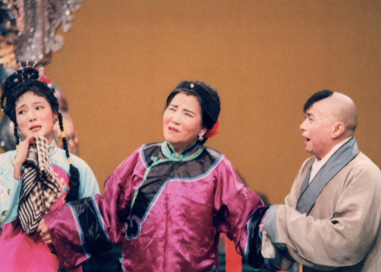 赵丽蓉与《西游记》剧组演员杨俊(左)、项汉(右)在晚会上表演小品《柜中缘》,这是赵丽蓉首度涉足小品领域