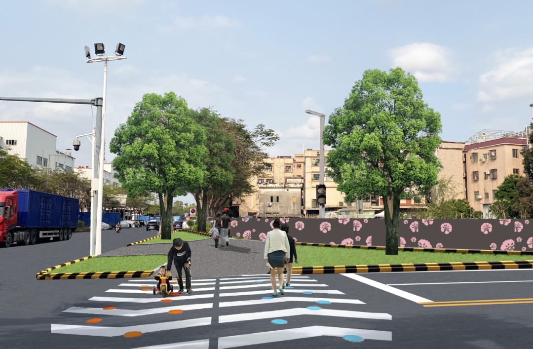 本工程致力于打造连贯、舒适、安全的绿色出行廊道,施工内容包括既有路面病害治理、慢行系统重构及附属设施完善等。 病害治理效果图 广碧路导流岛提升改造效果图