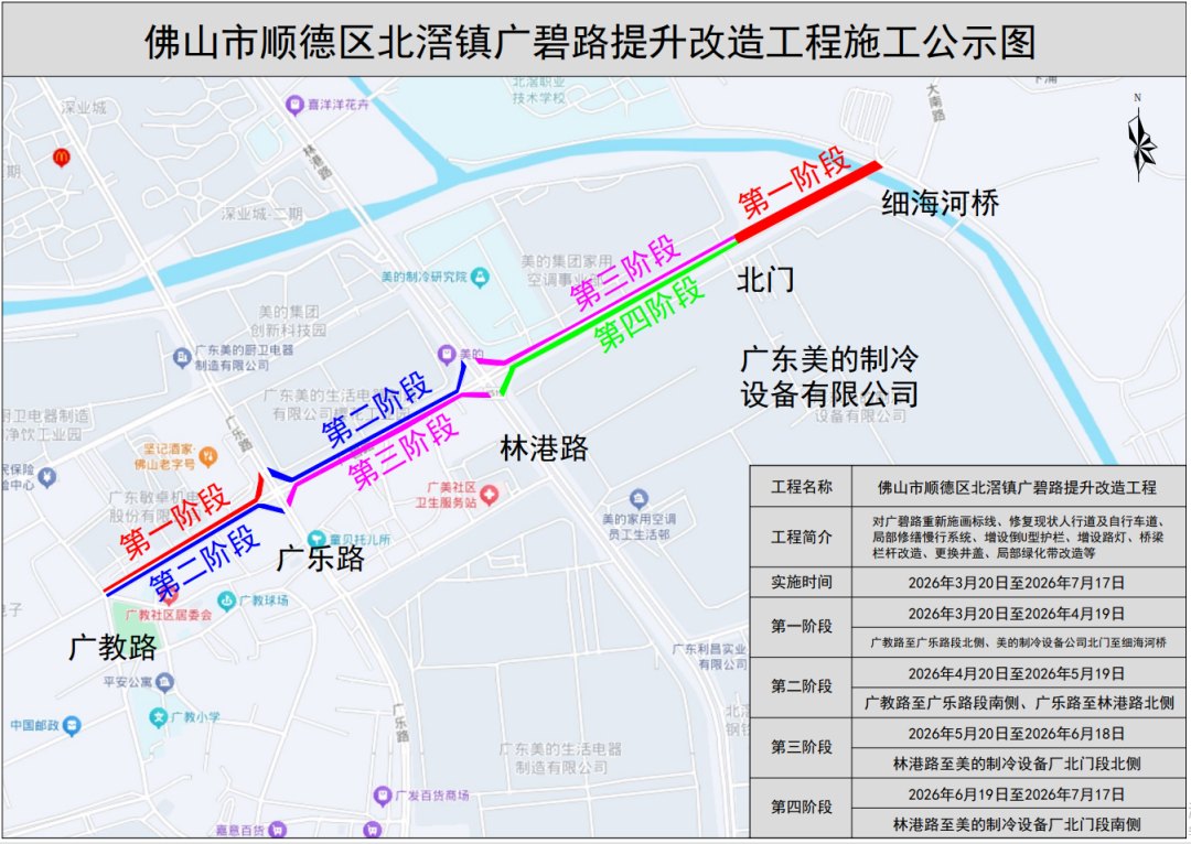项目将采用分阶段推进策略,保证车辆双向通行,确保施工期间交通基本畅通,最大限度减少施工对交通的影响。 广碧路提升改造工程施工计划