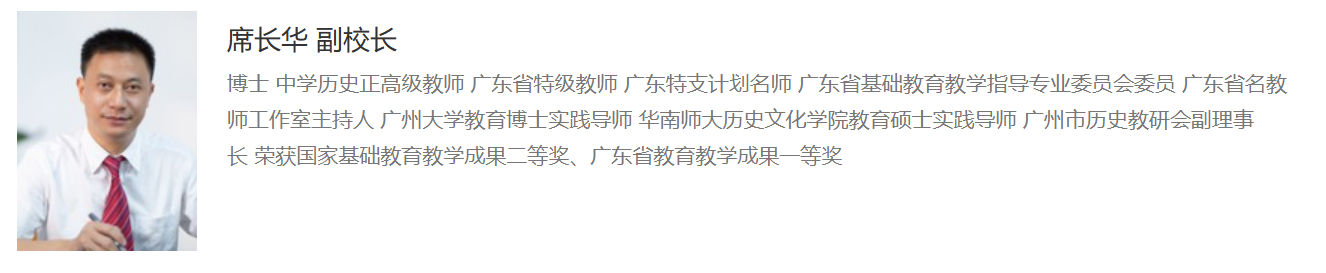 席长华原为广州大学附属中学副校长。他是博士,中学历史正高级教师,广东省特级教师,广东特支计划名师,广东省基础教育教学指导专业委员会委员,广东省名教师工作室主持人,广州大学教育博士实践导师,华南师大历史文化学院教育硕士实践导师,广州市历史教研会副理事长,荣获国家基础教育教学成果二等奖、广东省教育教学成果一等奖等。