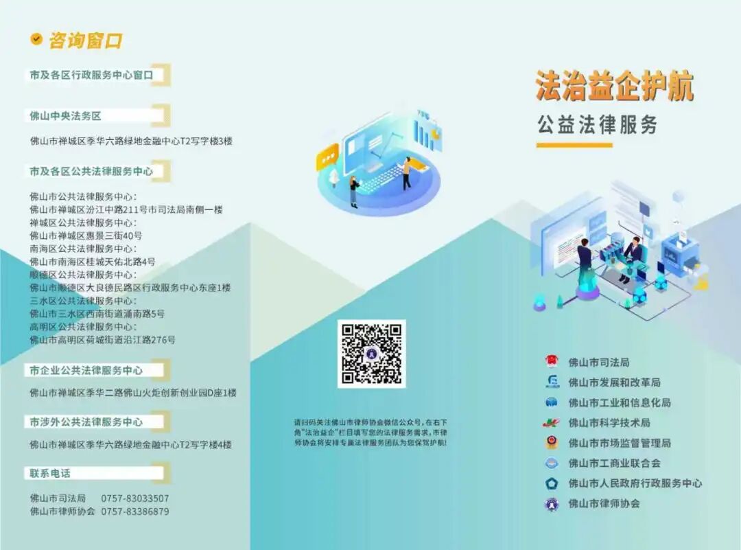 佛山“法治益企护航”公益法律服务去年启动以来,市司法局联合市律师协会等单位,为全市注册成立2年内的民营企业送上免费法治“大礼包”(免费期为1年,最长不超过2年),企业设立、劳动用工、企业经营、知识产权、内部管理、风险防范等六大类法律问题,都有专业律师团队一对一贴心指导。此前,企业主可以在市及各区行政服务中心等窗口领取纸质宣传手册,扫码填写需求,现在,线上申请渠道开通,办证同步申请免费法律服务,让创业更省心、更安心、更舒心!