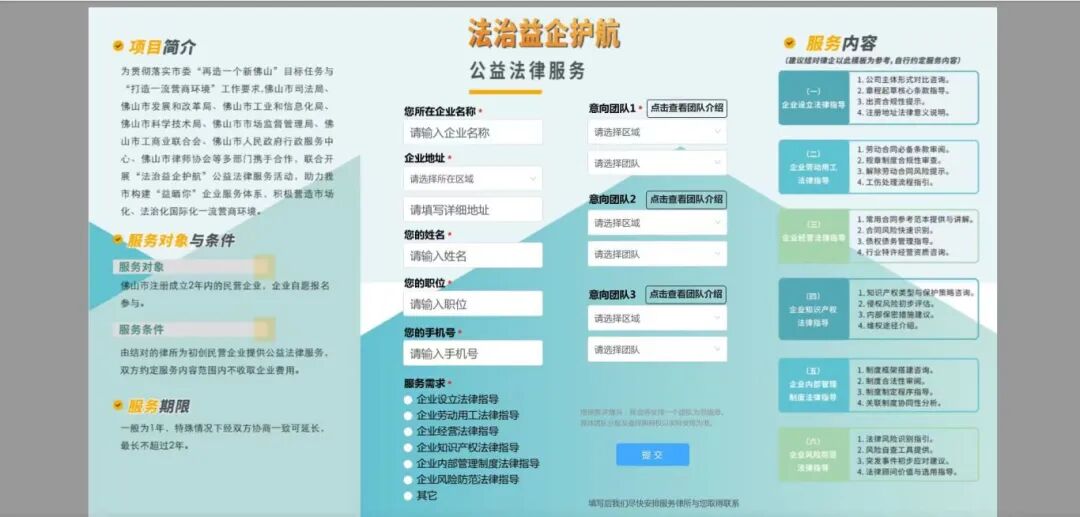 提交申请后,我们将为您及时安排适配的服务团队。如果您是符合条件的初创企业,千万别错过这份专属福利!如有疑问,也可咨询市司法局(0757-83033507)或市律师协会(0757-83386879)。