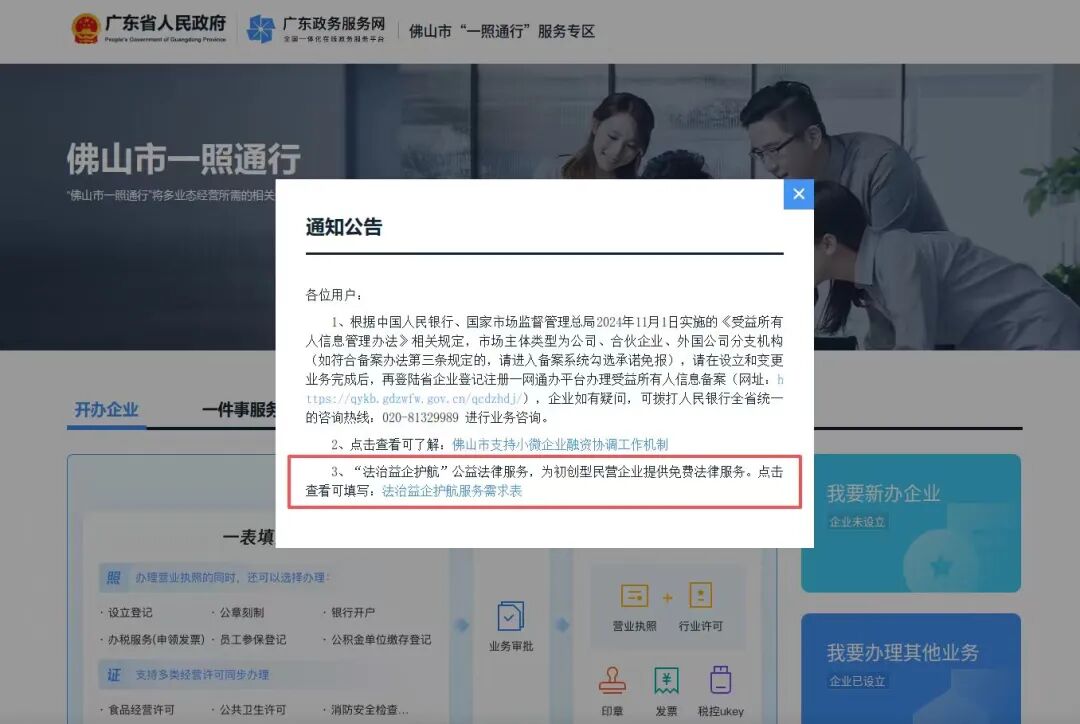 佛山“法治益企护航”公益法律服务再添新功能,线上服务需求表单正式入驻“佛山市一照通行”网站,各位创业者办企业证照时,可以一键填写法律服务需求、反馈意向服务团队,足不出户搞定公益法律服务申请,便捷度拉满!