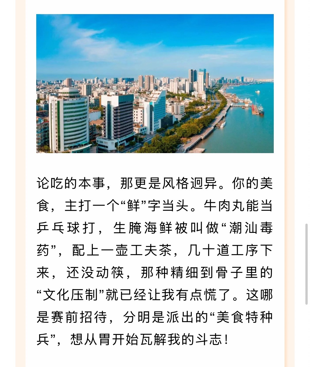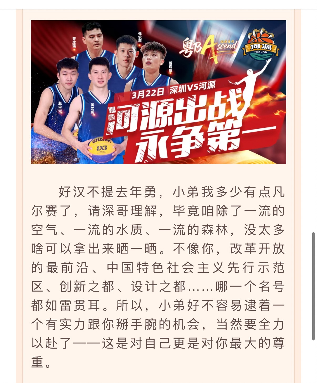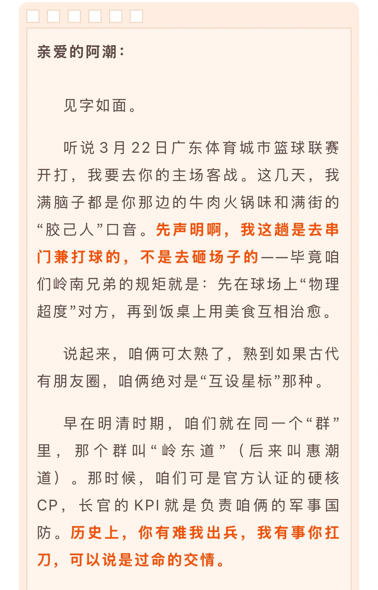 广东人,打球是认真的,造梗是专业的,安利家乡更是走心的。赛前“战书”写到最后,无一例外“上私货”——送攻略、发邀约,“来了就别走”。