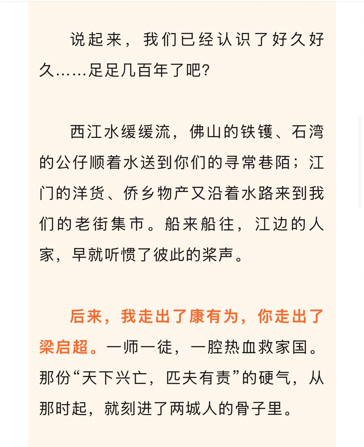 同饮西江水,佛山唤江门“阿江”。《致江门的一封信》里写满西江水路的旧时光:“船来船往,江边的人家,早就听惯了彼此的桨声。”几百年的水路往来,早已把两座城市紧紧连在一起。