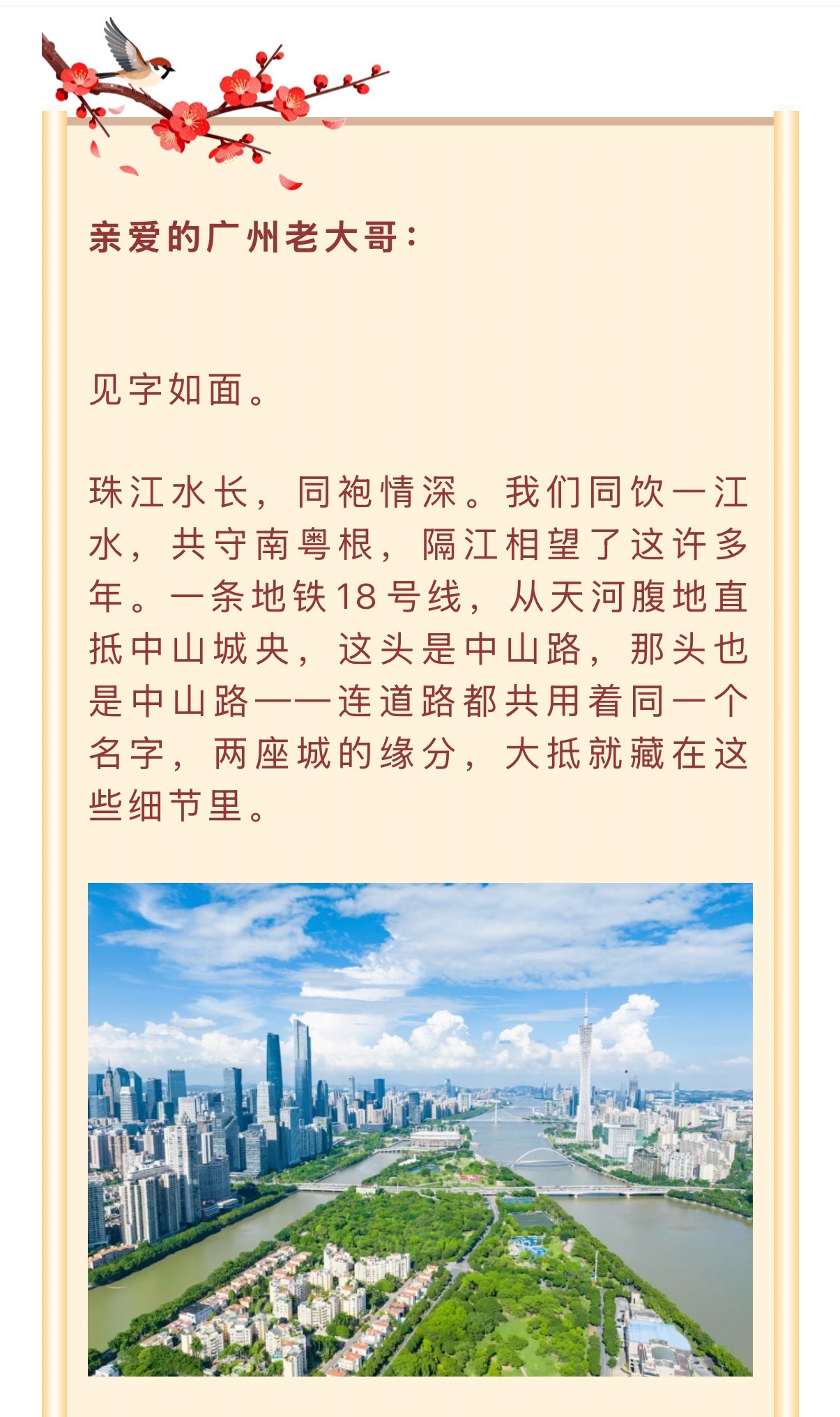 揭幕战率先亮相的广州和中山,堪称“兄友弟恭”。中山姿态很谦虚,《致广州老大哥的一封信》里说:“一条地铁18号线,这头是中山路,那头也是中山路——连道路都共用着同一个名字。”广州《致亲爱的中山吾弟》回复:“虾饺配乳鸽,早茶搭云吞,烟火滋味同源,这便是我们最踏实的情谊。”