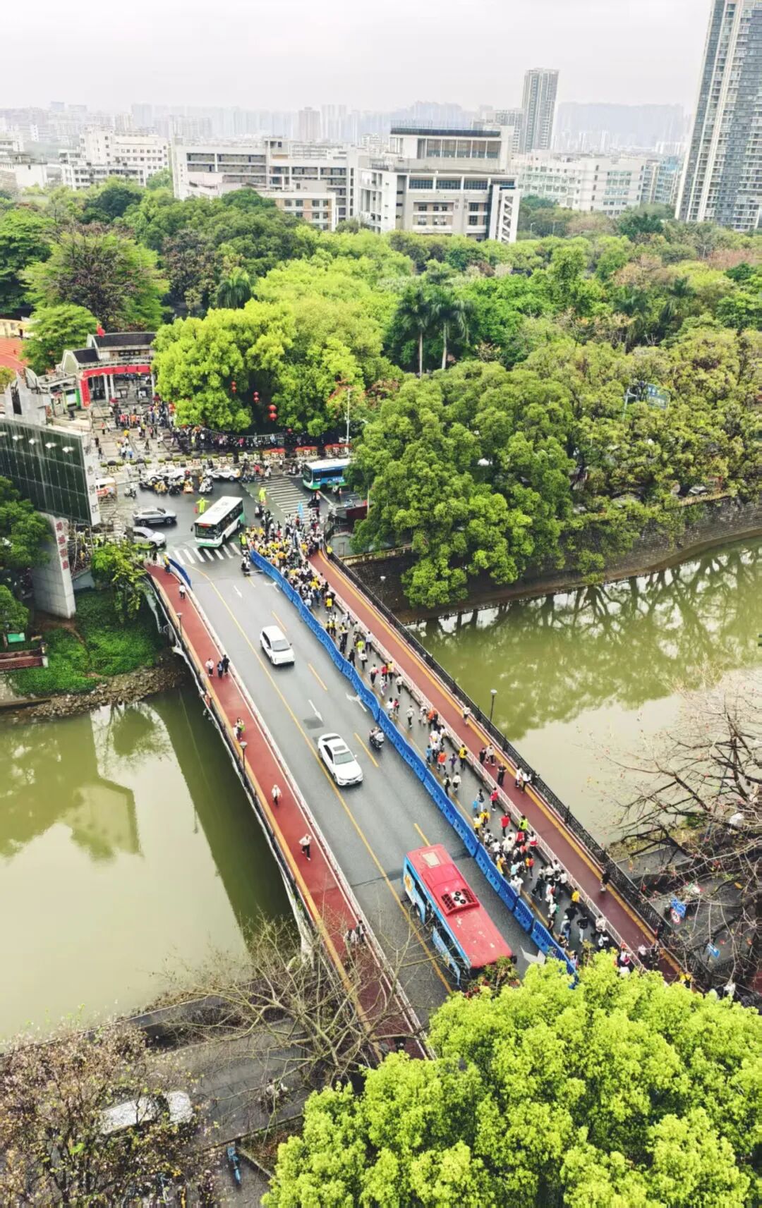 禅城汾江桥上人流如织。在延时镜头下,市民步履不停穿梭而过,以脚步丈量城市,尽享春日汾江风光。图/佛山市新闻传媒中心记者周春 摄