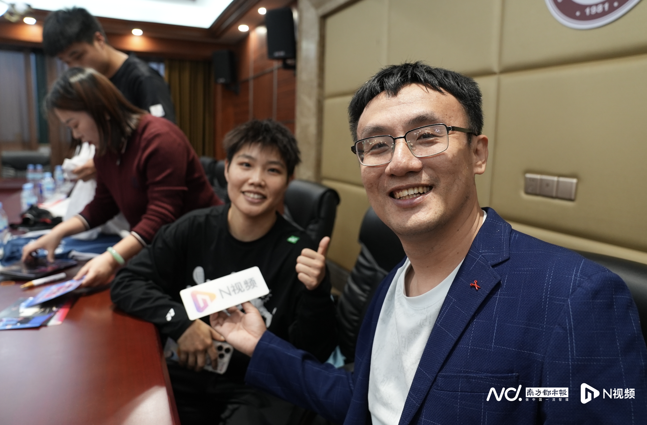 南都N视频记者周正阳(右)采访羽毛球混双冠军黄东萍间隙。