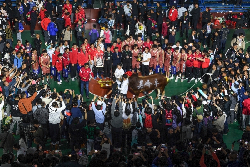 广东沙溪队斩获村BA全国总冠军,吴进拍下作为奖品的关岭黄牛。