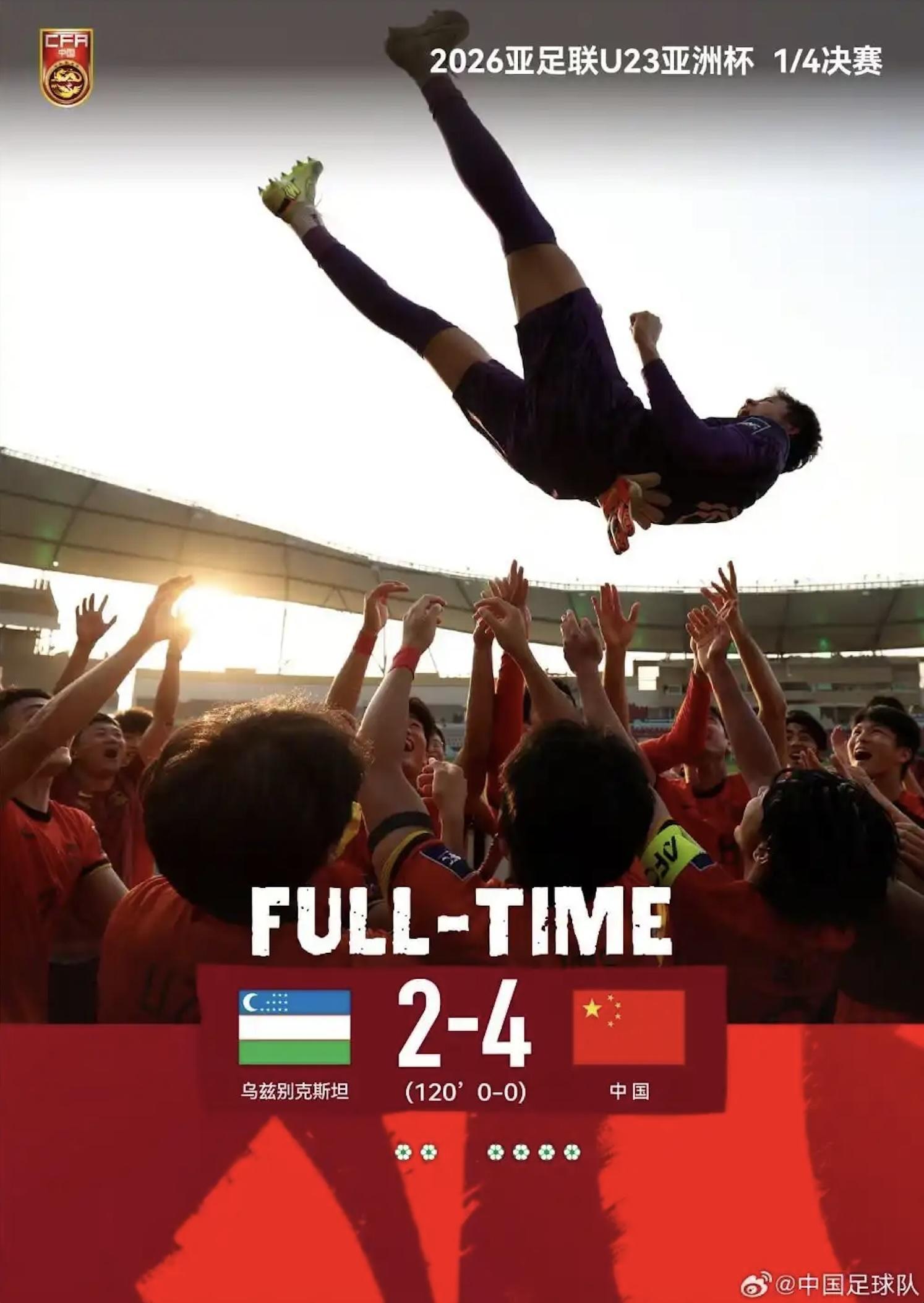 李昊在对阵乌兹别克斯坦队赛后,被队友们高高抛起庆祝。图源:中国足球队微博