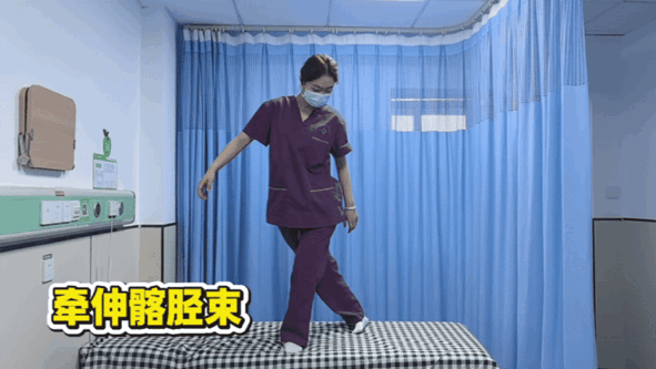 髂胫束本身延展性差,主要是放松其连接的肌肉。可采用站立交叉姿,双腿交叉,身体向后方腿一侧侧弯,同时将同侧髋部向外顶出。