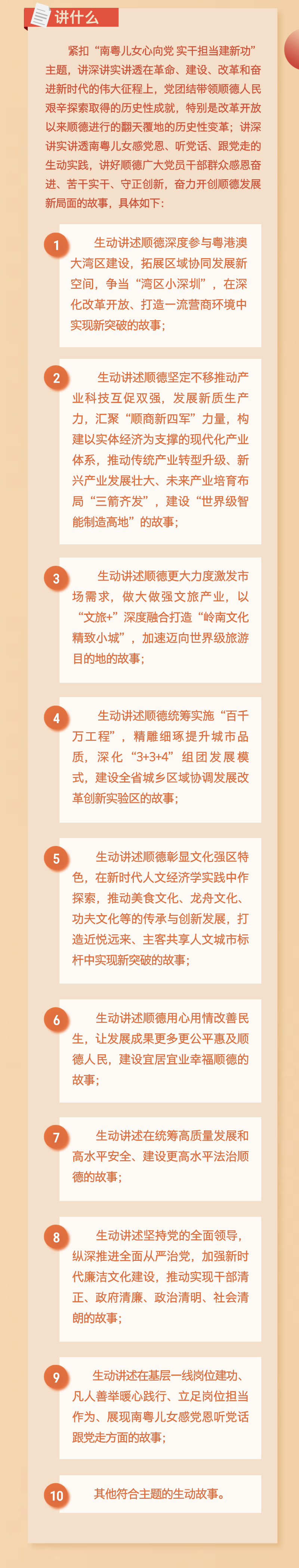 把机器人“讲活”了的副总裁,在全省拿了大奖 广东嘉腾机器人自动化有限公司副总裁陈洪波不是专业演讲家,却用坚韧不拔的创业故事打动全场,把“制造业当家”的宏大主题,讲成了有温度、有热血的创业故事,并斩获广东省“粤讲粤精彩”演讲比赛二等奖。 这个东北“女婿”,把顺德美食讲到全市一等奖 顺德美食推荐官、广东省旅游大使刘炳旭不是顺德本地人,却比谁都懂顺德味,把“寻味顺德·一口入魂”讲进了全市宣讲比赛一等奖的领奖台。 她把“顺德味”讲出了“天下鲜”,拿下全市大奖 顺德人家酒店总经办主任刘婷婷是顺德美食最接地气的“代言人”,把美食行业的一线故事讲得活色生香、入脑入心,并斩获佛山市宣讲比赛二等奖。 想和他一样站上舞台 讲述顺德精彩吗? 2026年顺德区宣讲比赛等你来 下一个“声”入人心的宣讲员 就是你! 向下滑动查看所有内容