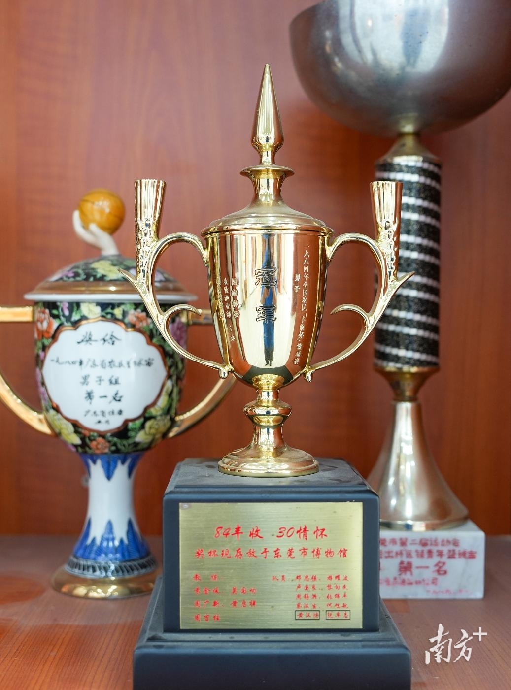 1984年的全国首届农民“丰收杯”篮球大赛上,东莞常平队代表广东出战夺得男篮冠军。图为大赛奖杯。南方+记者 王俊涛 摄