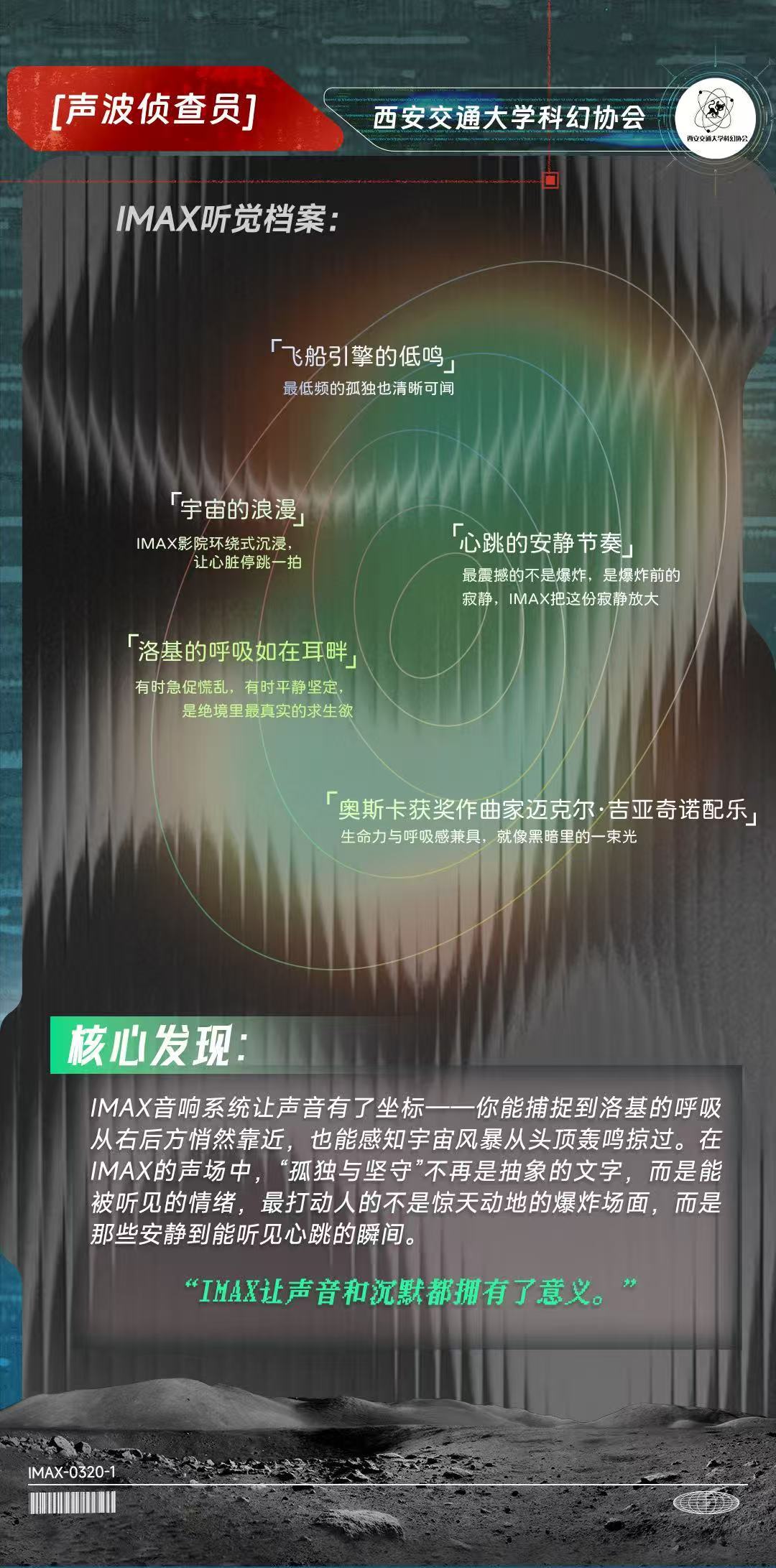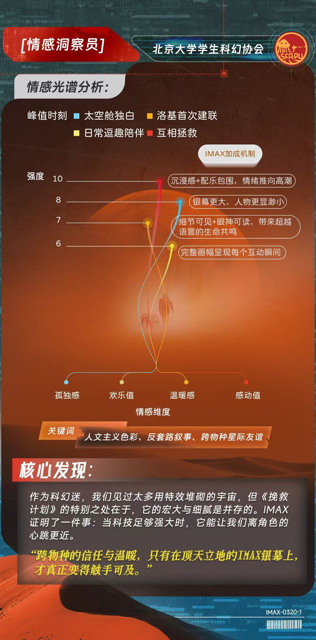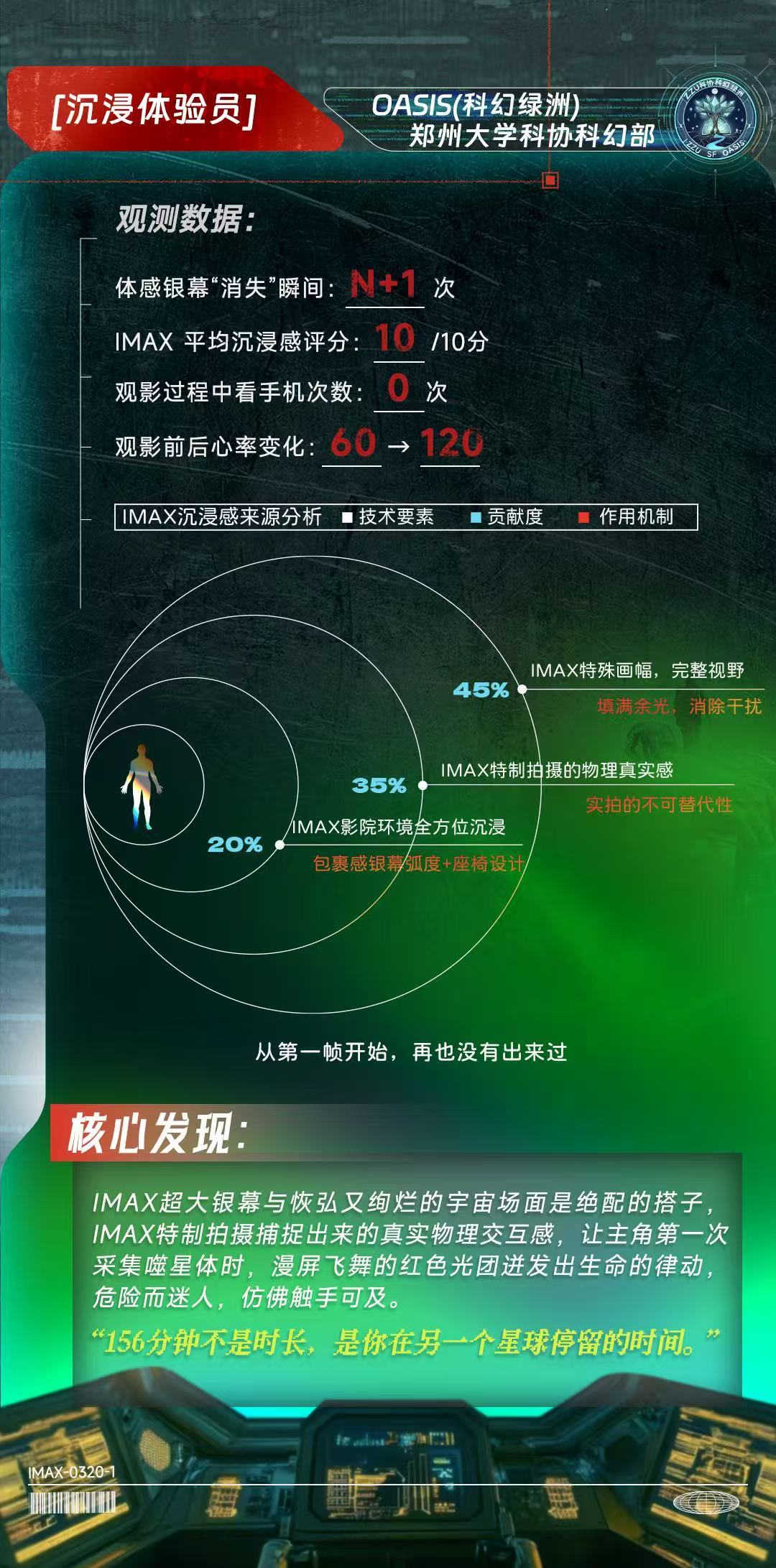 近日,IMAX联合高校科幻平台,与北京大学学生科幻协会、哈尔滨工业大学思飞科幻社、郑州大学科协科幻部、山东大学学生科幻协会、南华大学极星科幻协会、西安交通大学科幻协会等六所高校科幻社团,共同完成了一份关于IMAX特制拍摄的深度观测报告。这群年轻科幻迷化身“研究员”,从画幅、细节、声波、情感、美学、沉浸感六个维度,记录下156分钟的沉浸体验。