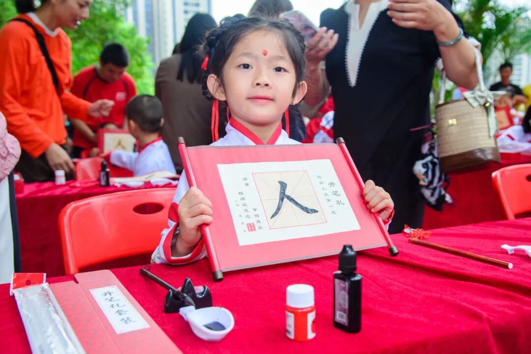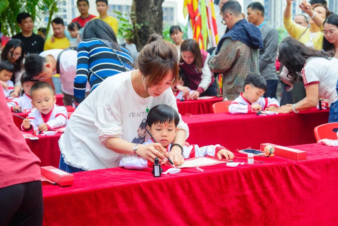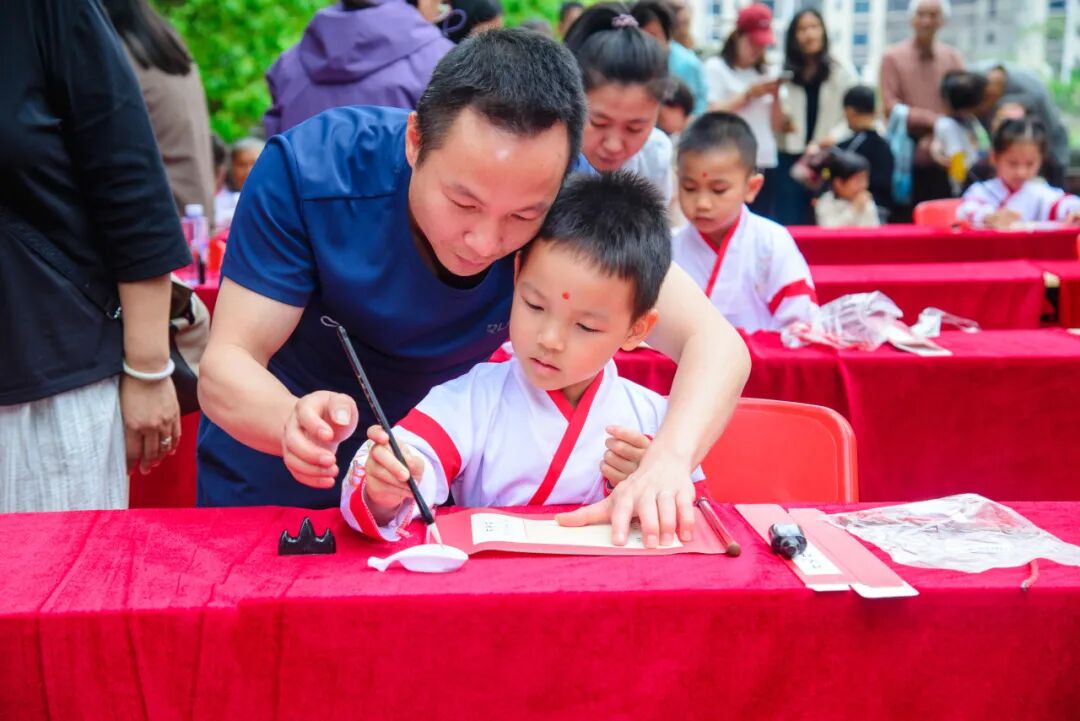在庄重的仪式中,学童们依次进行了“正衣冠”“朱砂启智”“击鼓鸣志”和“启蒙描红”等环节。优秀学子手持朱笔,在每一位学童的额头正中点上红痣,寓意开启智慧之眼,祝愿孩子们从此眼明心亮,好读书、读好书。