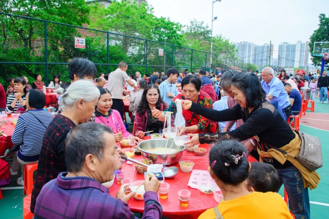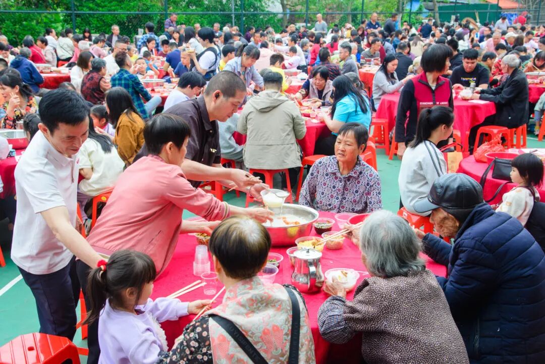开笔礼结束后,村中广场上架起了大锅灶,热气腾腾的千人濑粉宴正式开席。濑粉作为本地特色传统美食,寓意长长久久、福寿绵长。现场人头攒动,不仅本村村民扶老携幼前来,许多外出务工的乡贤和远道而来的亲友也纷纷落座。